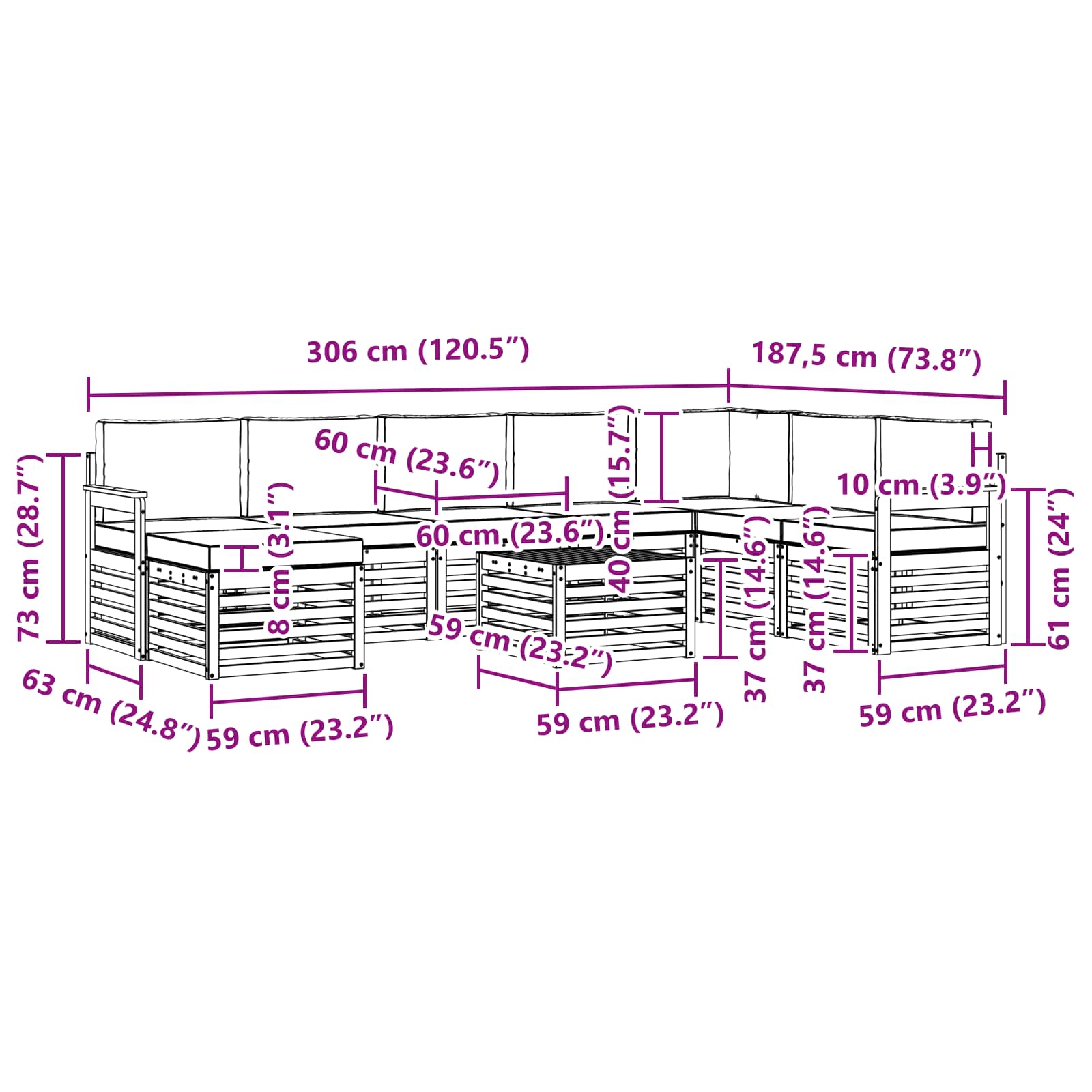 • 6 x Středová pohovka: 63 x 59 x 73 cm (D x Š x V)