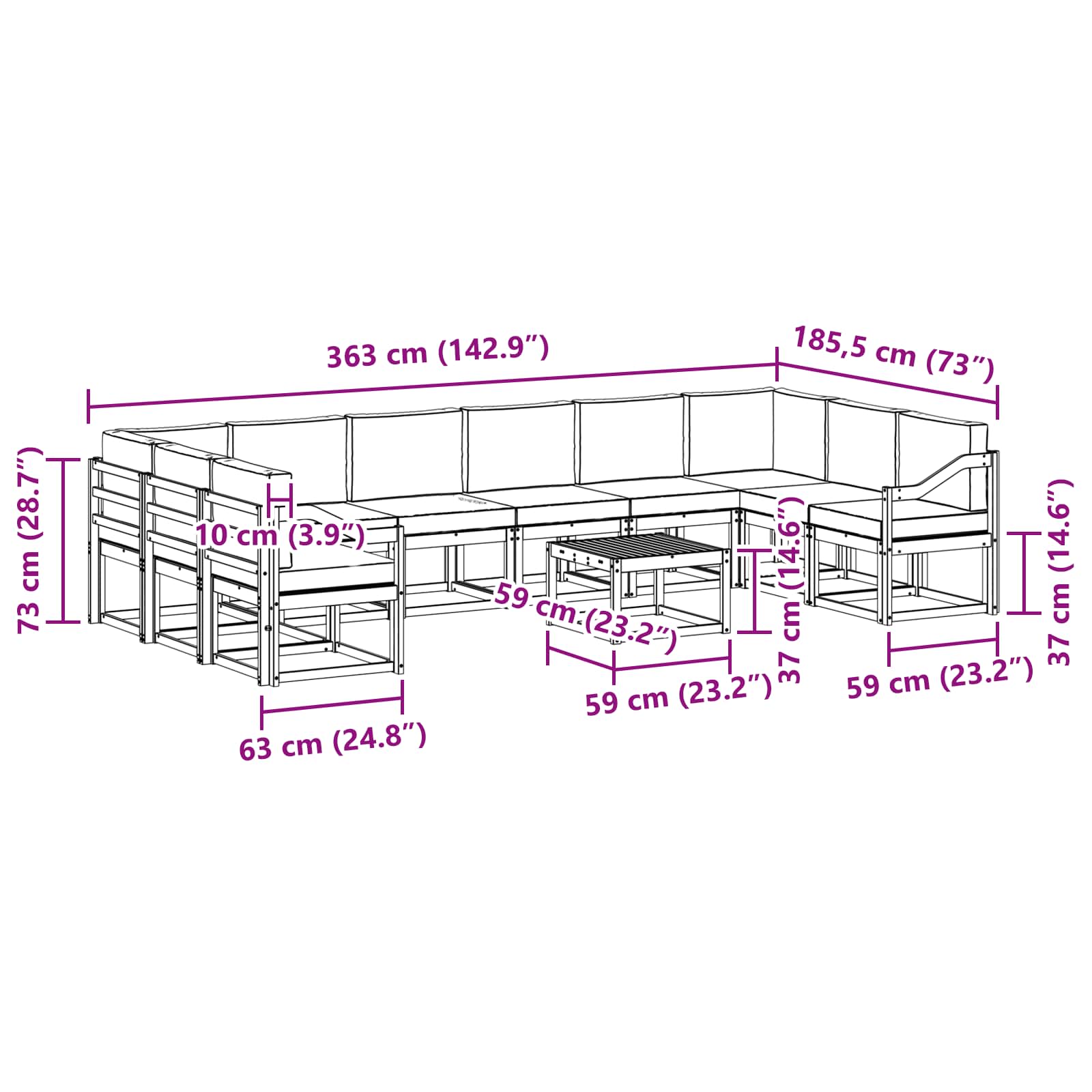 • 8 x Střední pohovka: 59 x 63 x 73 cm (D x Š x V)