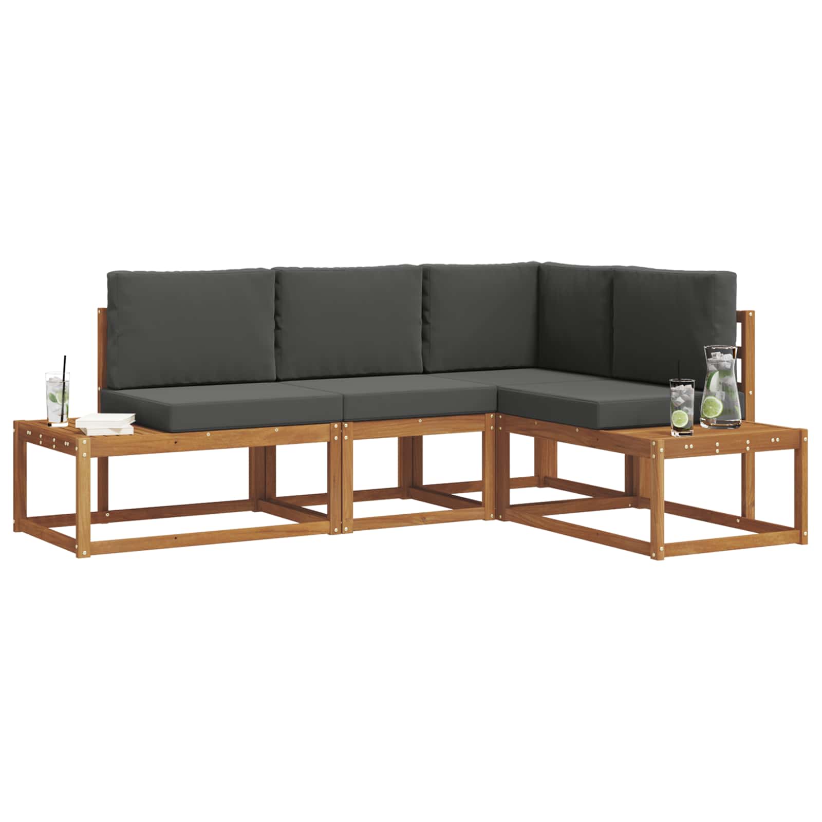 • Materiály: Tato modulární pohovka je z masivního akáciového dřeva, které je pevné a krásné. Akáciové dřevo zajišťuje, že pohovka vydrží a zachovává si svůj vzhled i při venkovním používání. Její teplý, hnědý povrch podtrhuje její klasický vzhled.