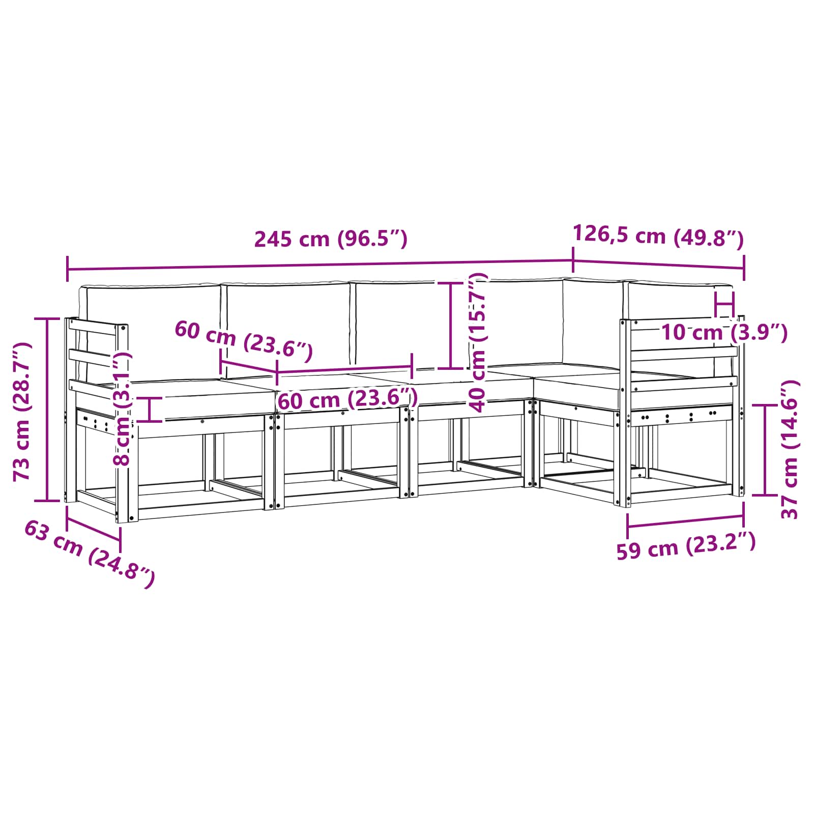 • 4 x Střední pohovka: 59 x 63 x 73 cm (D x Š x V)