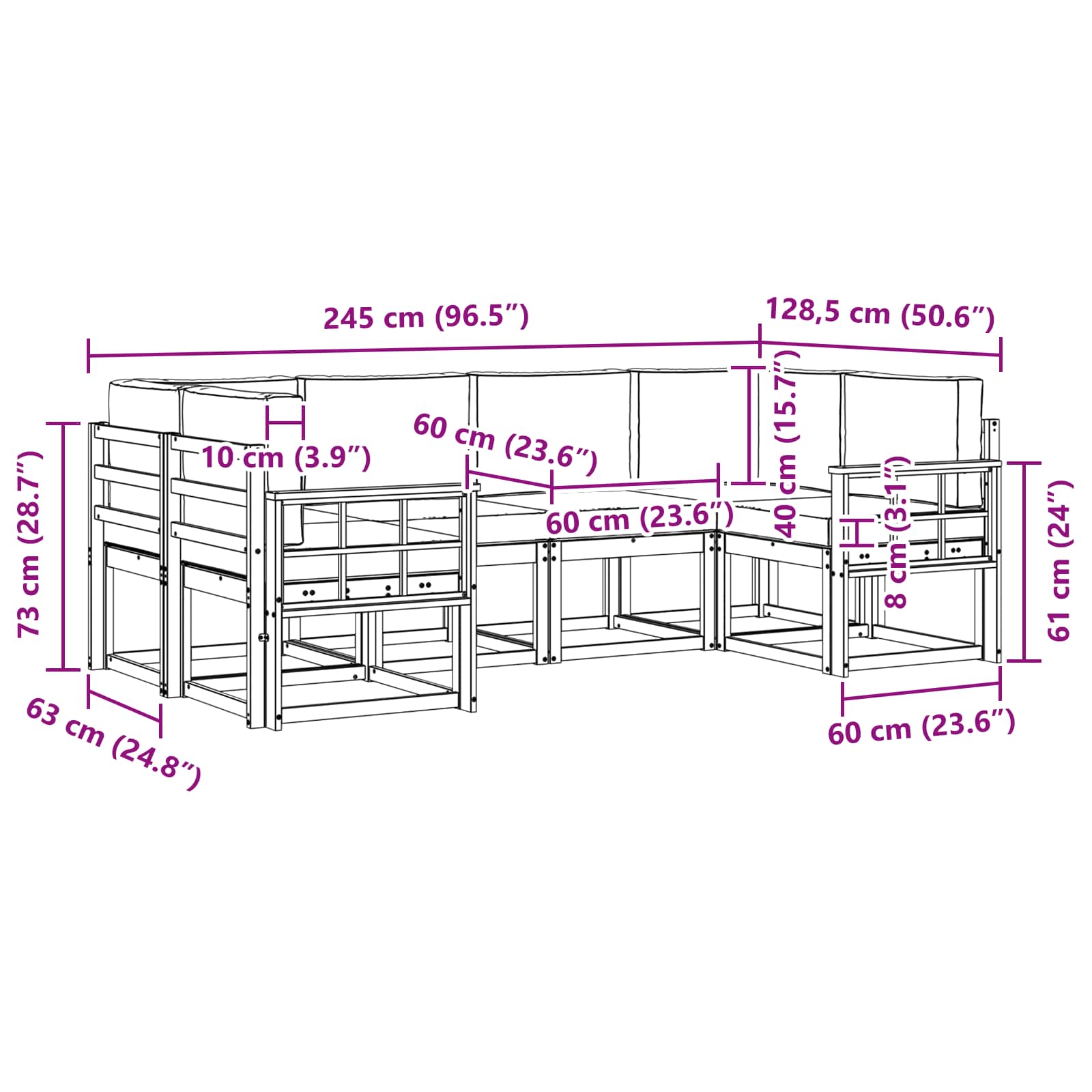 • 8 x Záda polštář: 60 x 40 x 10 cm (D x Š x V)