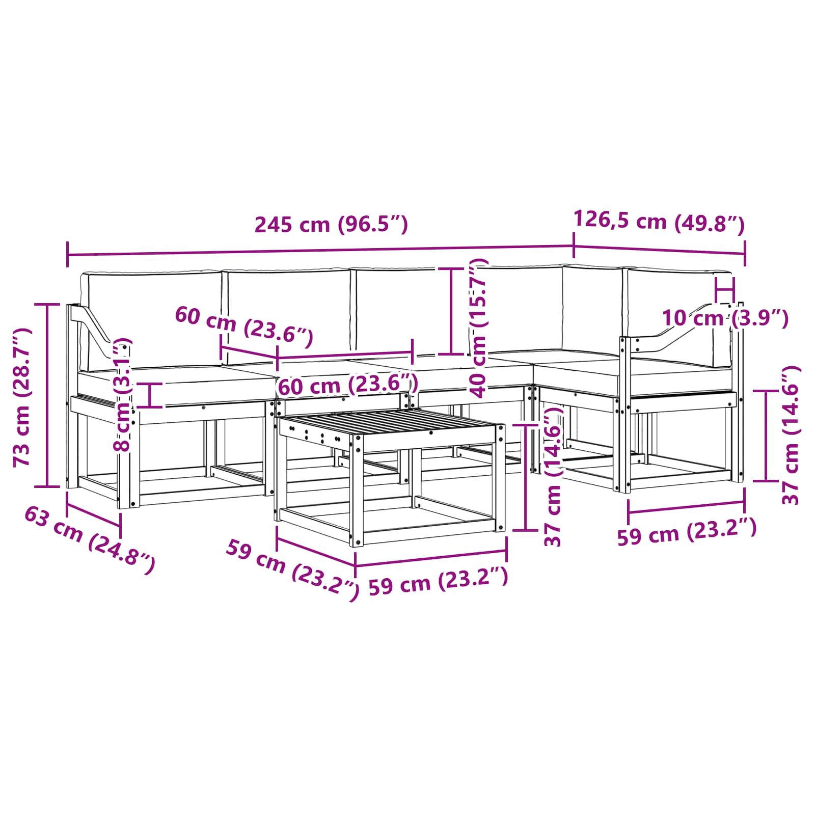 • 4 x Střední pohovka: 59 x 63 x 73 cm (D x Š x V)