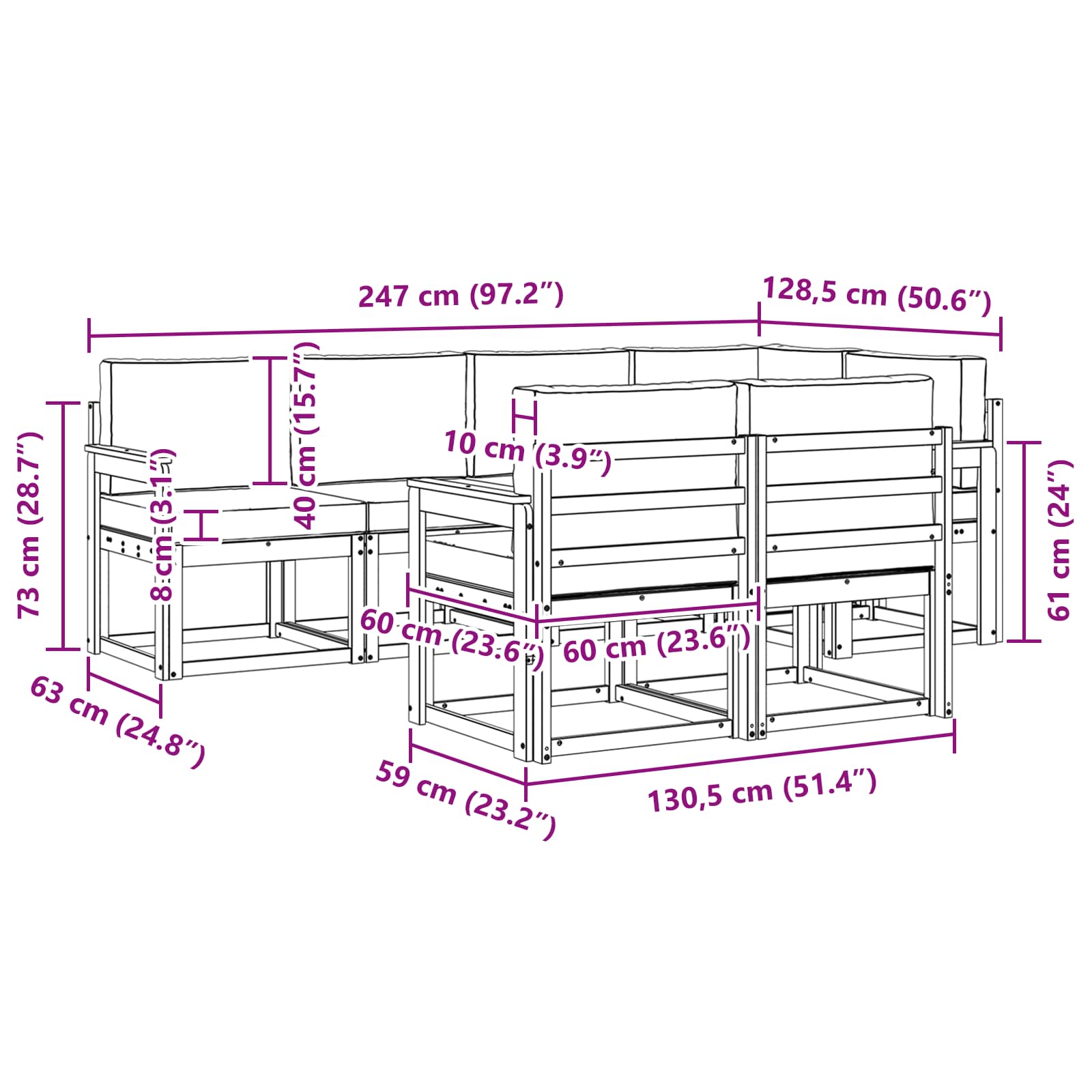• 6 x Středová pohovka: 59 x 63 x 73 cm (D x Š x V)