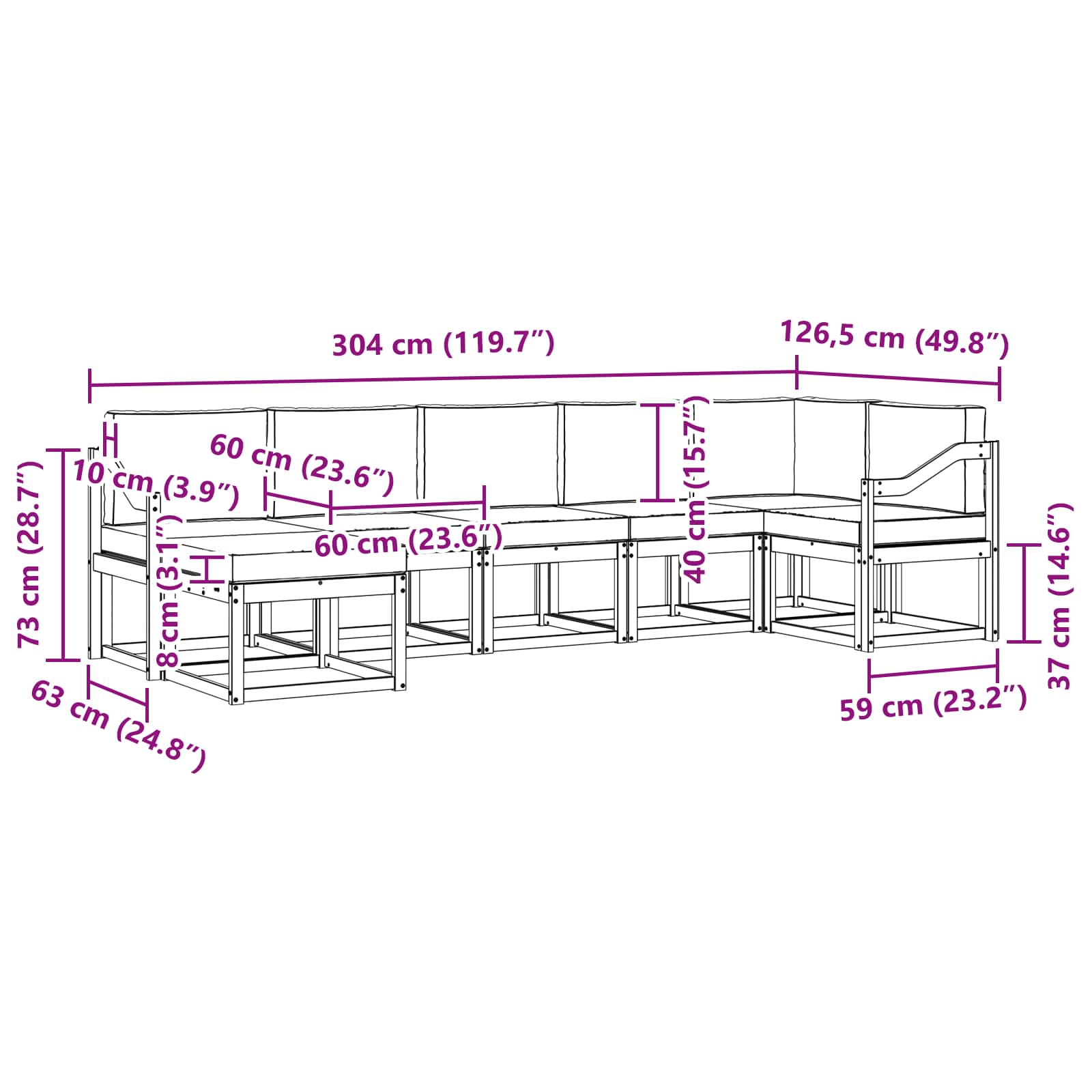 • 5 x střední pohovka: 59 x 63 x 73 cm (D x Š x V)