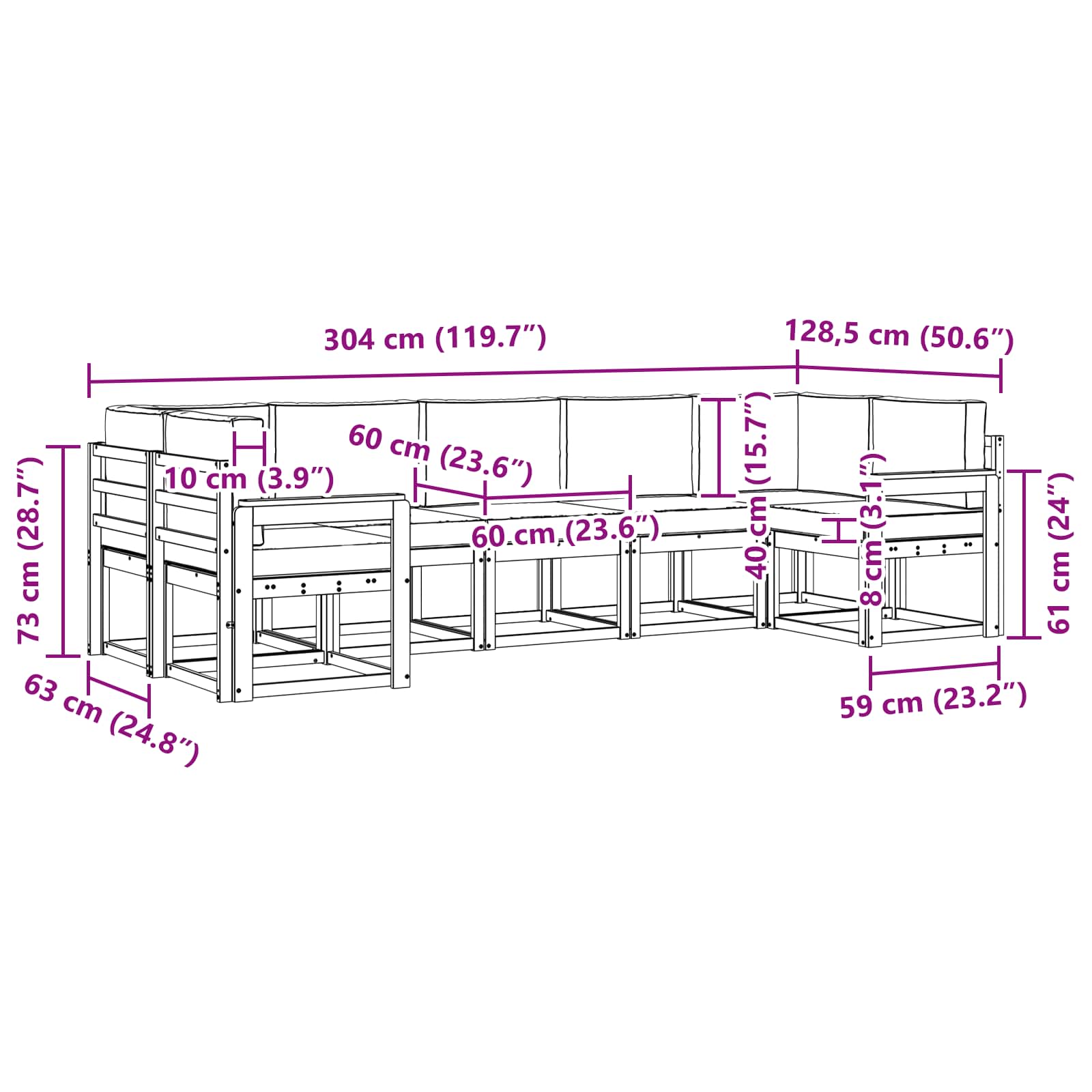 • 5 x Střední pohovka: 59 x 63 x 73 cm (D x Š x V)