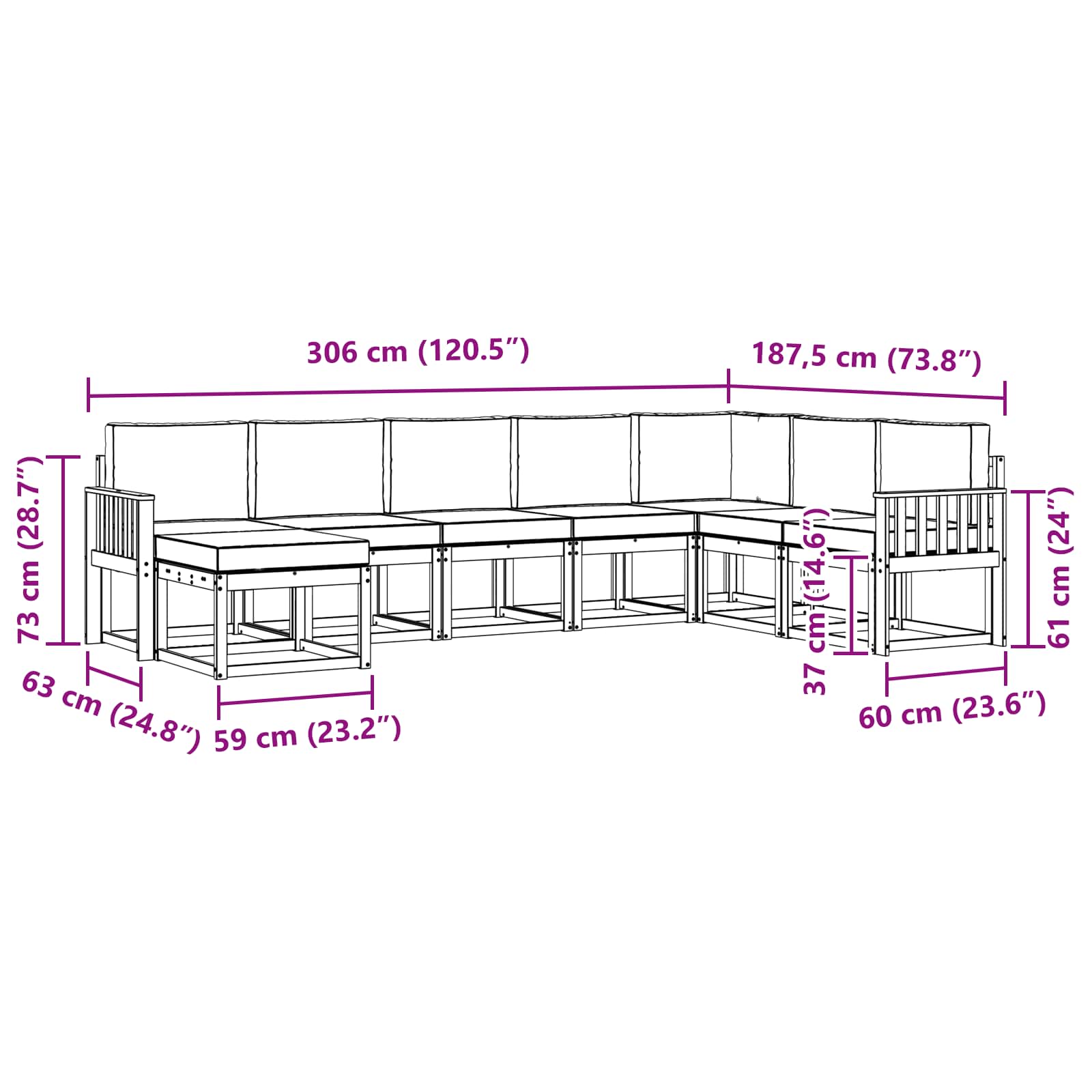 • 6 x Středová pohovka: 59 x 63 x 73 cm (D x Š x V)