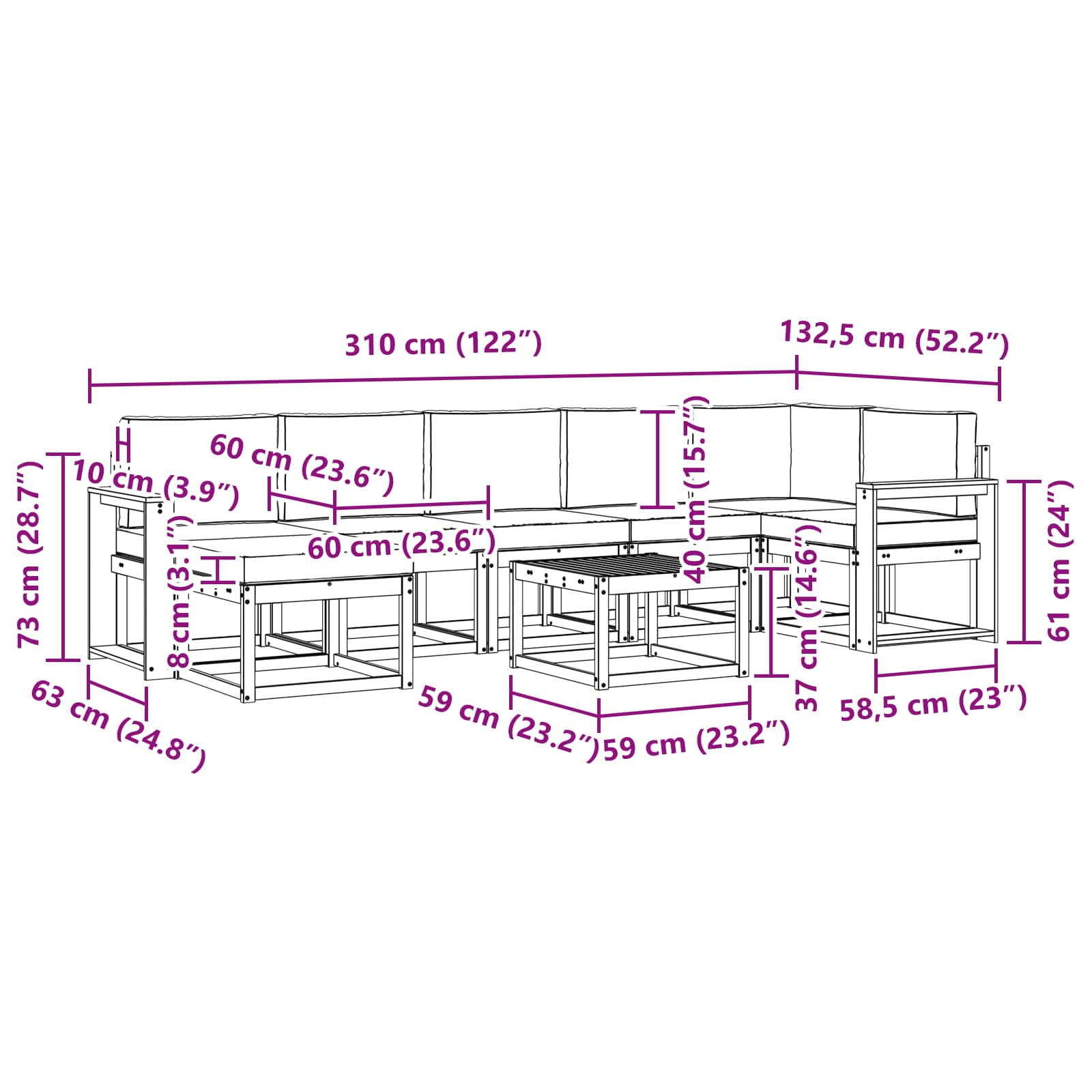• 5 x Střední pohovka: 59 x 63 x 73 cm (D x Š x V)