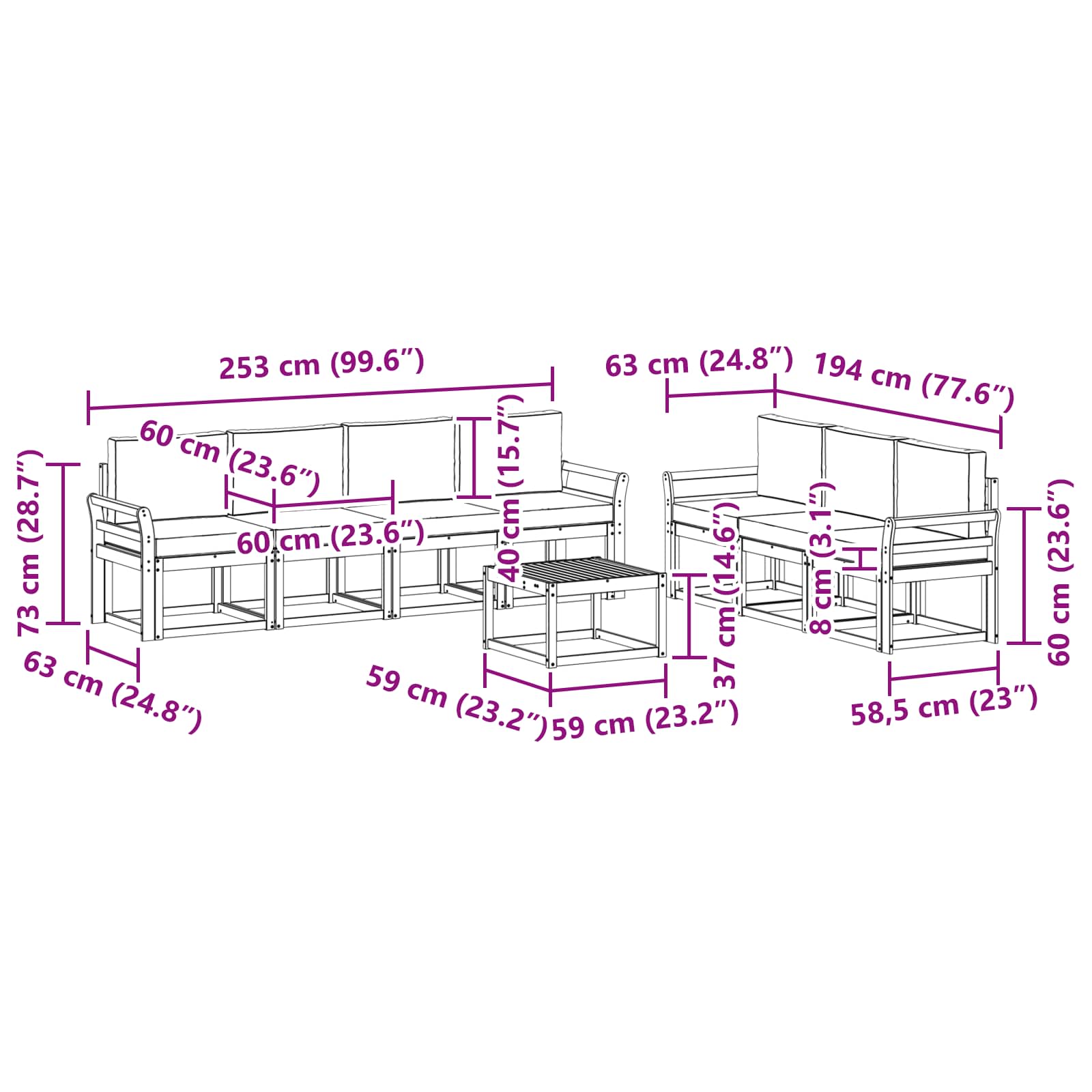 • 7 x středový pohovka: 59 x 63 x 73 cm (D x Š x V)