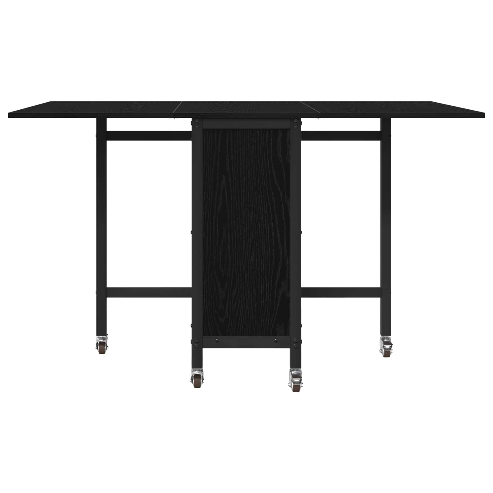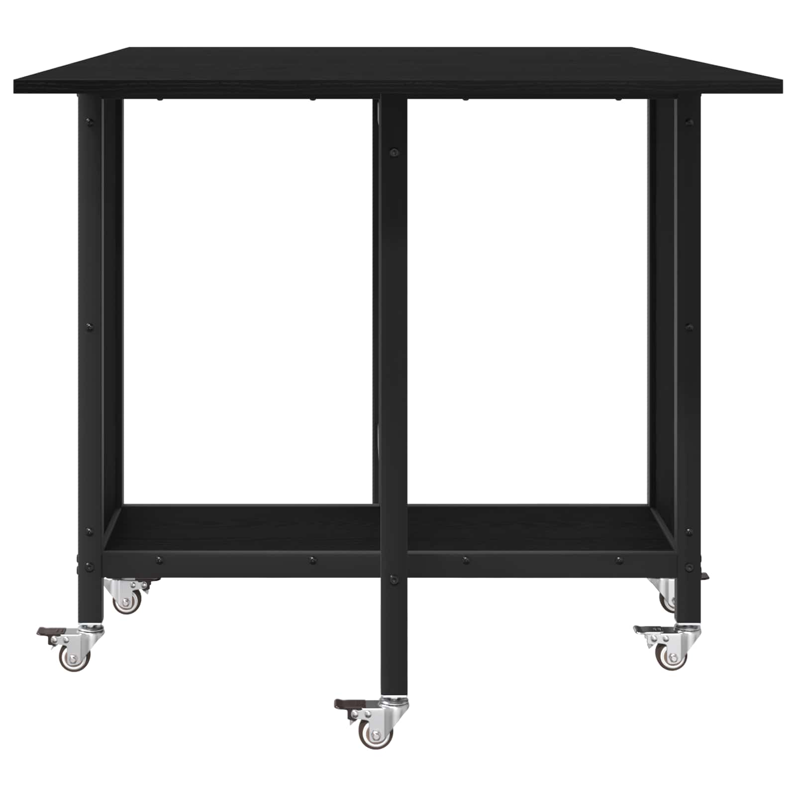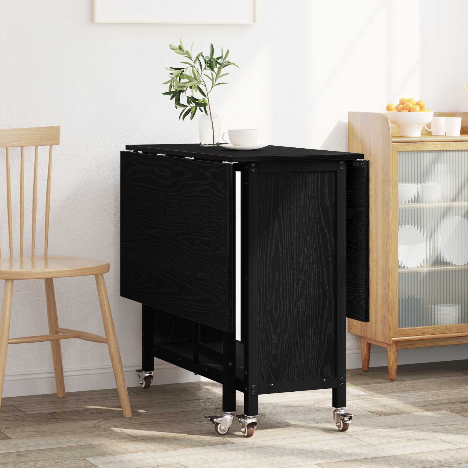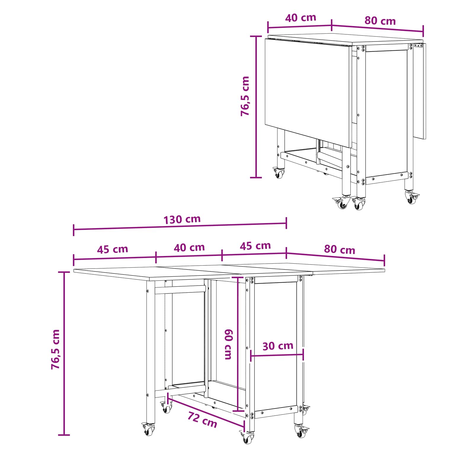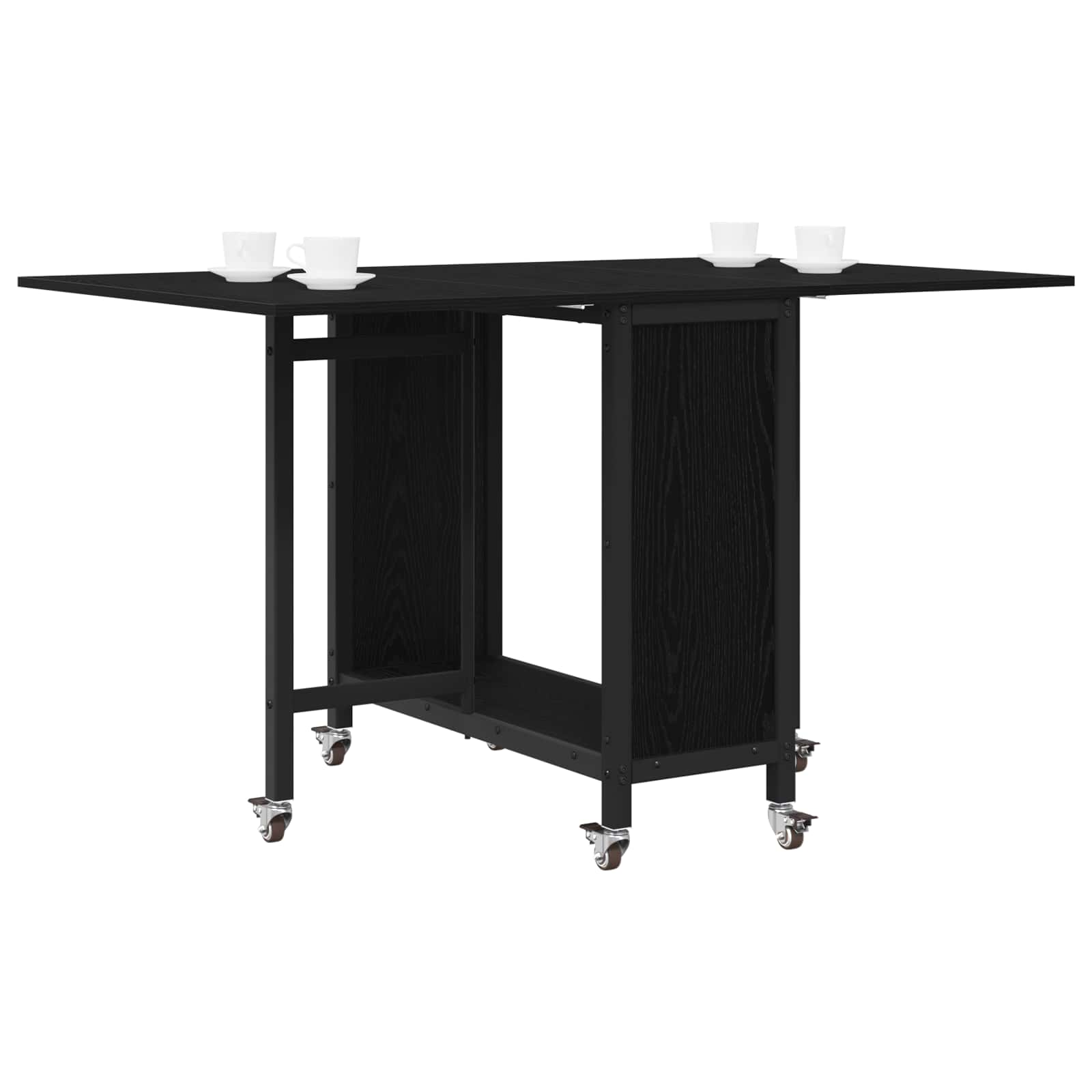Tento stůl má hladký dřevěný povrch a šest uzamykatelných koleček. Oboustranný skládací design šetří místo a nižší police vytváří úložný prostor. Perfektní pro rodinné nebo přátelské jídlo.