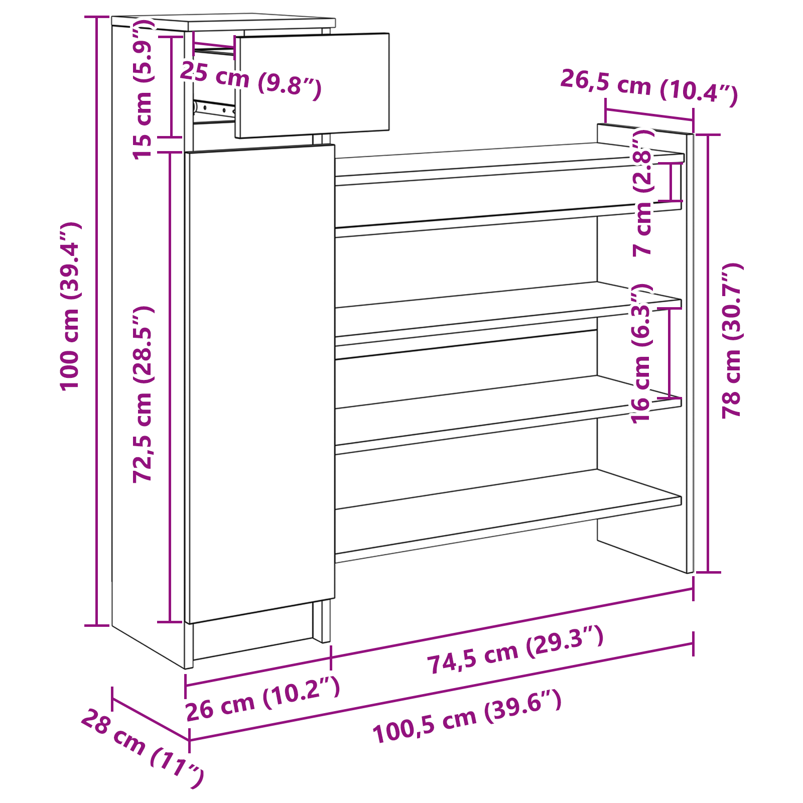 Tento elegantní botník je příkladem moderního designu – jednoduchý ale funkční. Skvěle se hodí do jakéhokoli obýváku a nabízí spoustu místa na vaše boty, zatímco minimalistický styl se hodí do současného interiéru. S rozměry 100,5 x 28 x 100 cm je to diskrétní a kompaktní řešení pro váš uklizený prostor.