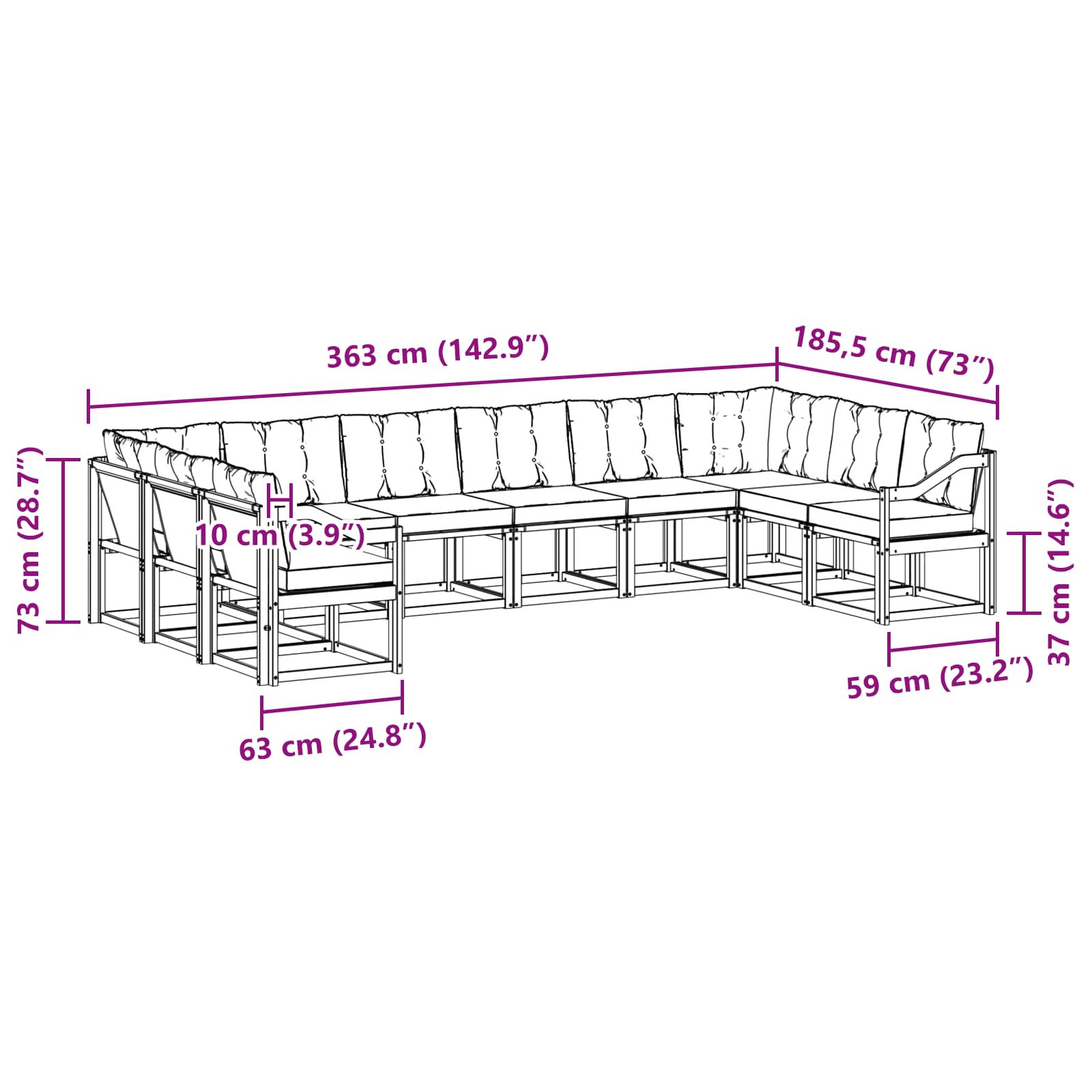 • 8 x Střední pohovka: 59 x 63 x 73 cm (D x Š x V)