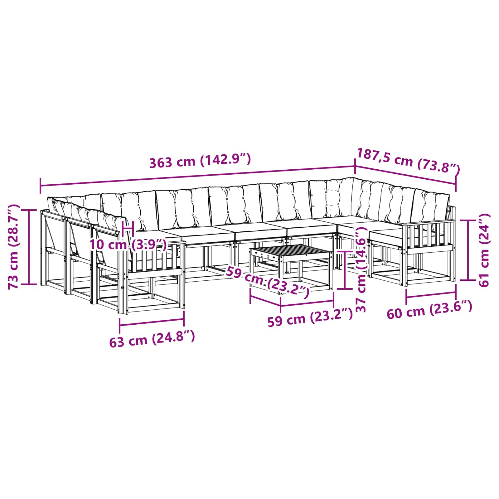 • 8 x Střední pohovka: 59 x 63 x 73 cm (DxŠxV)