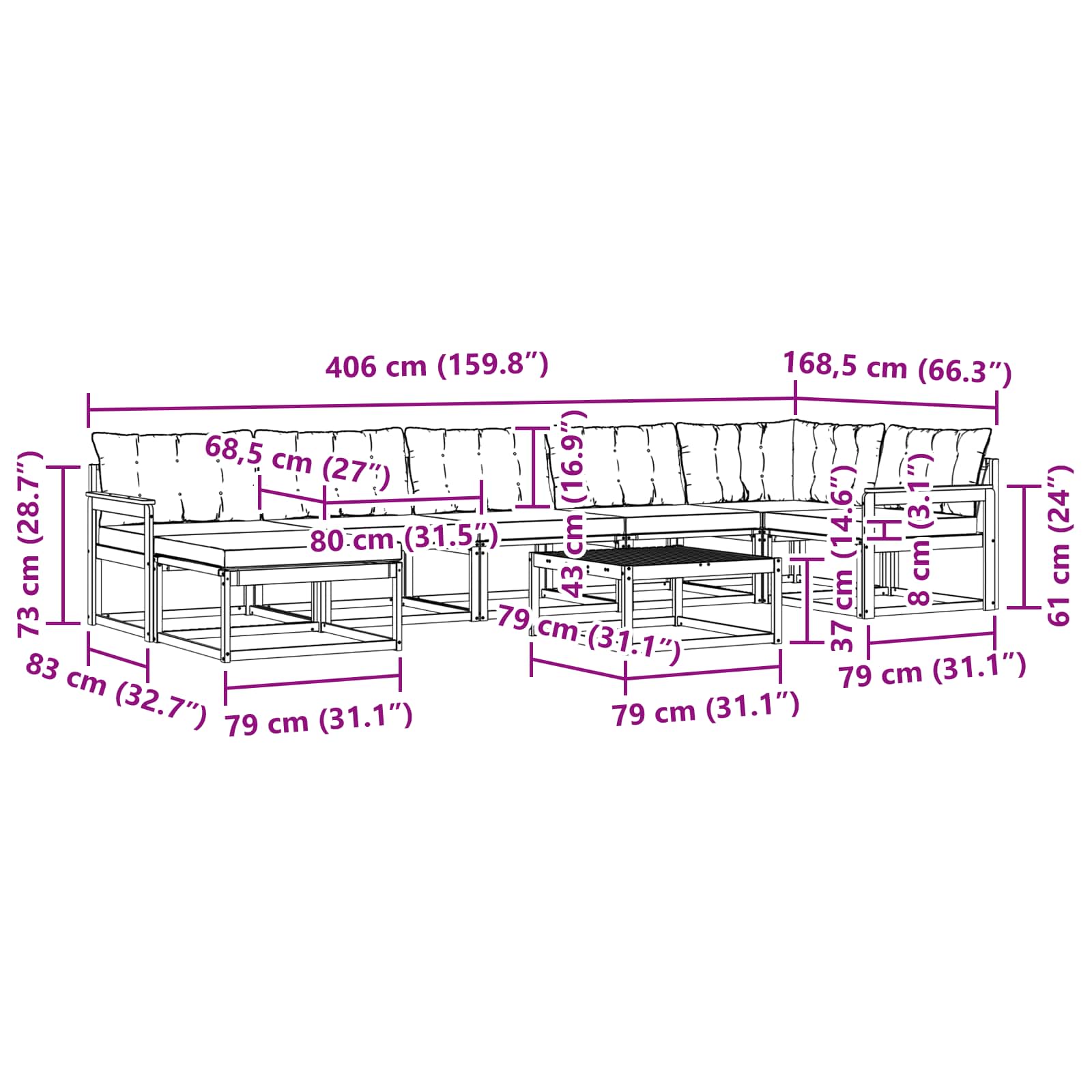 • 5 x Střední pohovka: 79 x 83 x 73 cm (D x Š x V)