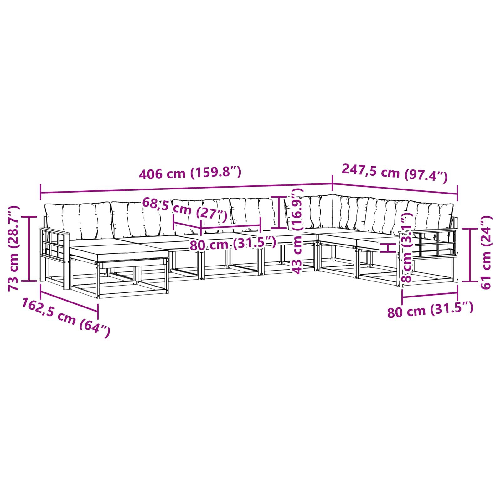 • 8 x Zádový polštář: 80 x 43 x 10 cm (D x Š x V)