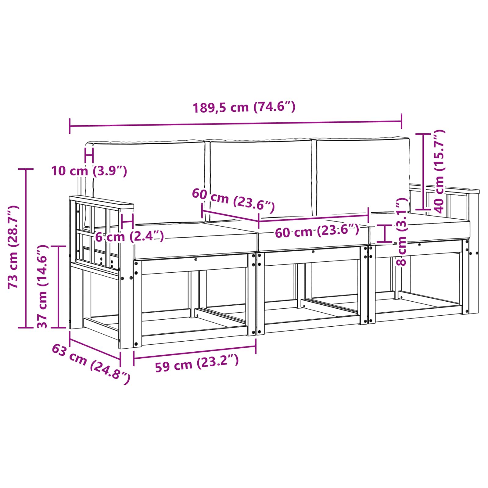 • 3 x Střední pohovka: 59 x 63 x 73 cm (D x Š x V)