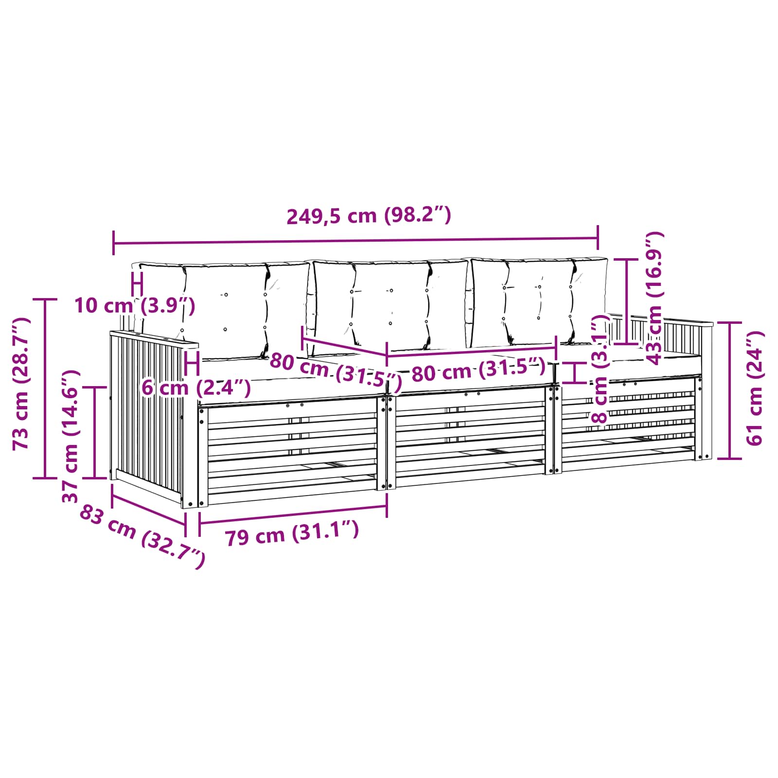 • 3 x Zadní polštář: 80 x 43 x 10 cm (DŠV)