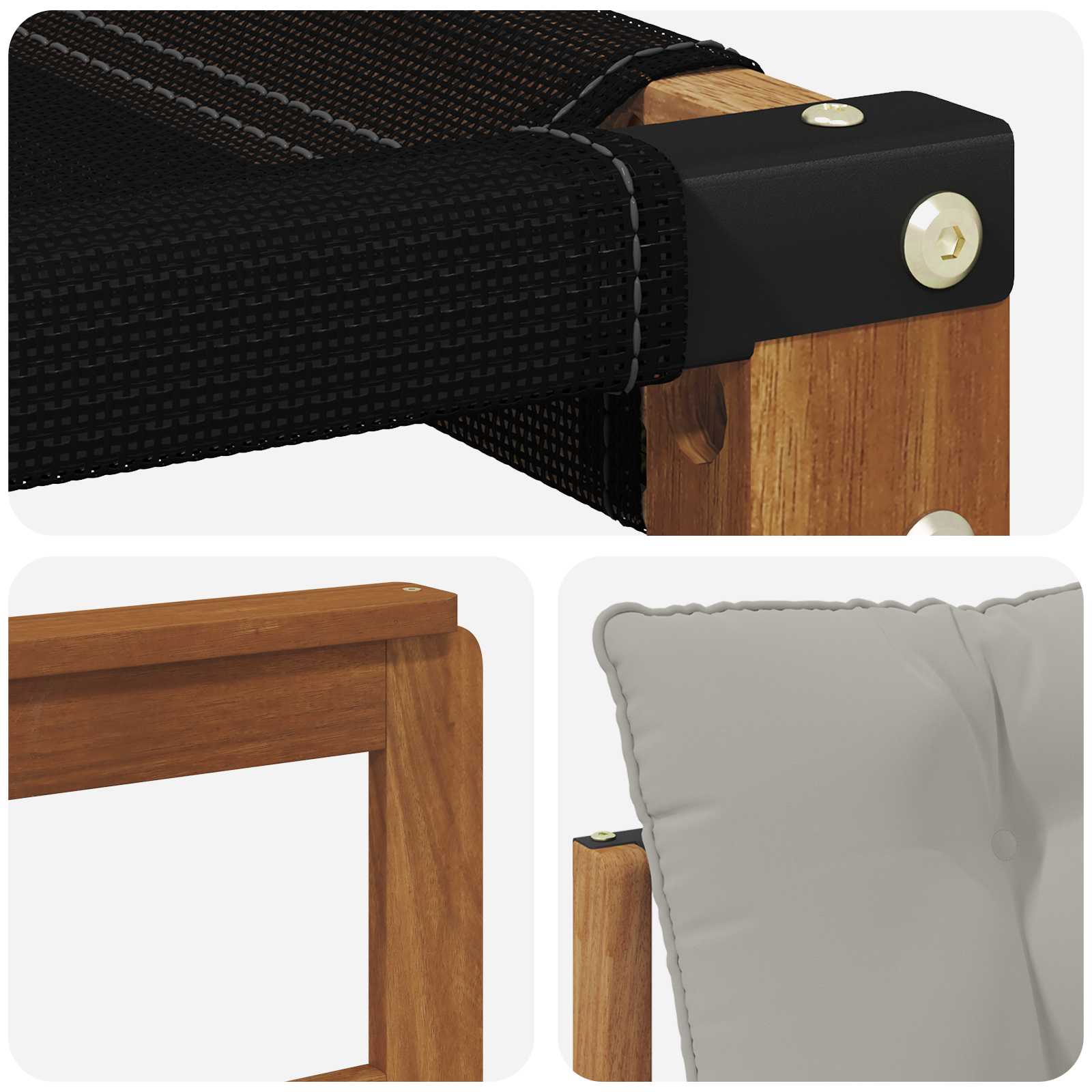 • Odolné masivní akáciové dřevo: Tento vynikající venkovní nábytek, vyrobený z akáciového dřeva, je známý svou odolností a snášenlivostí vůči nepříznivým počasím. Pevná konstrukce poskytuje bezpečné sezení a dlouhou stabilitu, zatímco teplý přírodní odstín zkrášluje vaši zahradu či terasu.