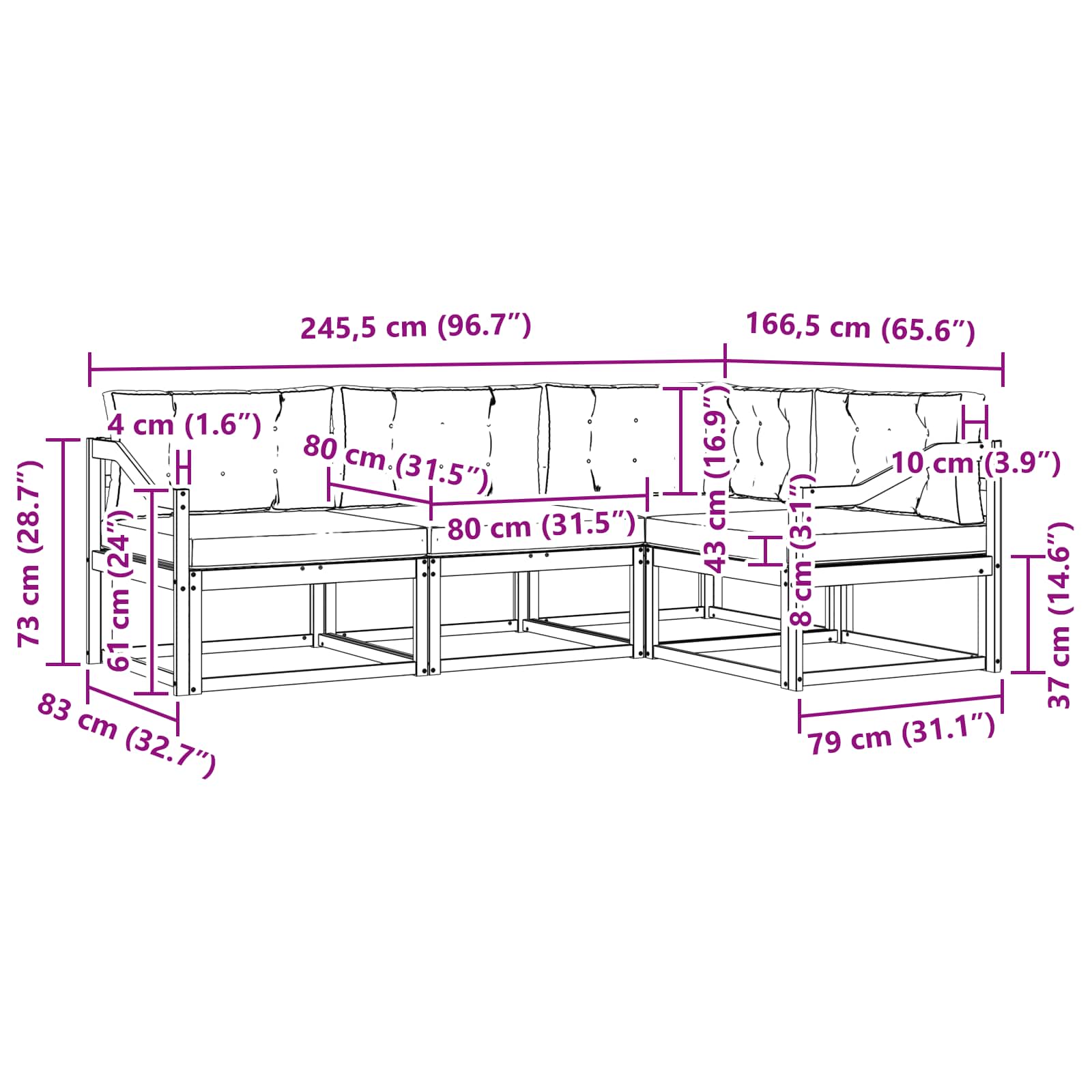 • 4 x Sedací polštář: 80 x 80 x 8 cm (D x Š x V)
