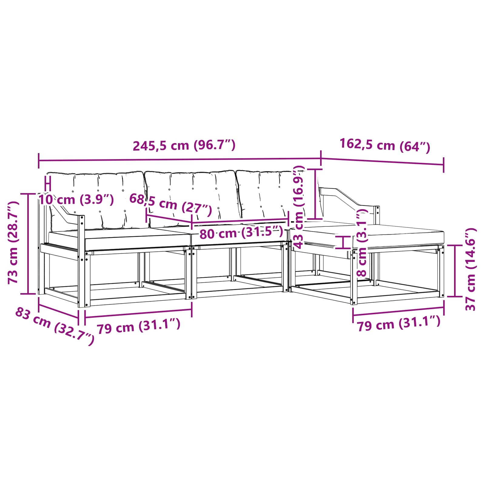 • 3 x střední pohovka: 79 x 83 x 73 cm (DxŠxV)