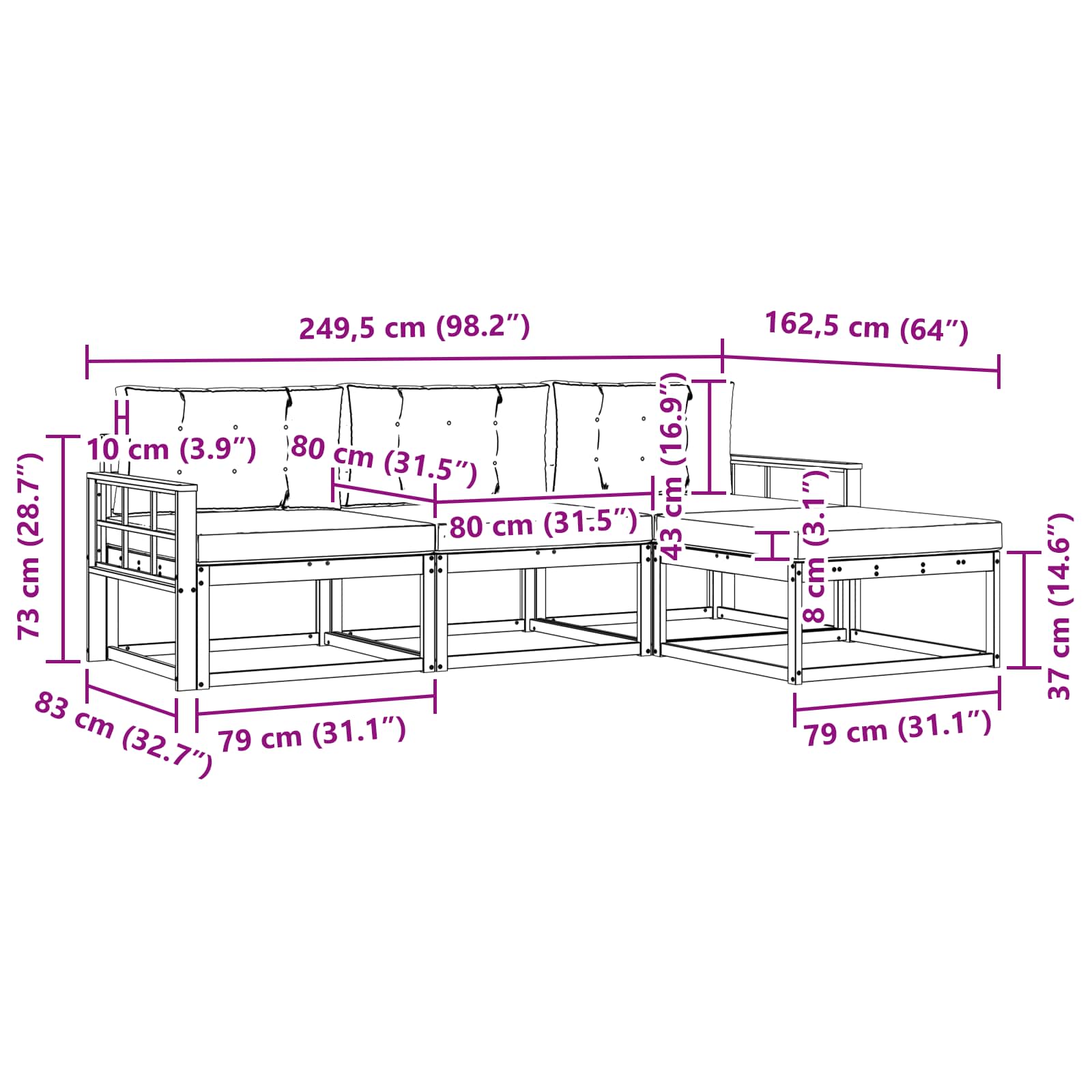 • 3 x střední pohovka: 79 x 83 x 73 cm (D x Š x V)
