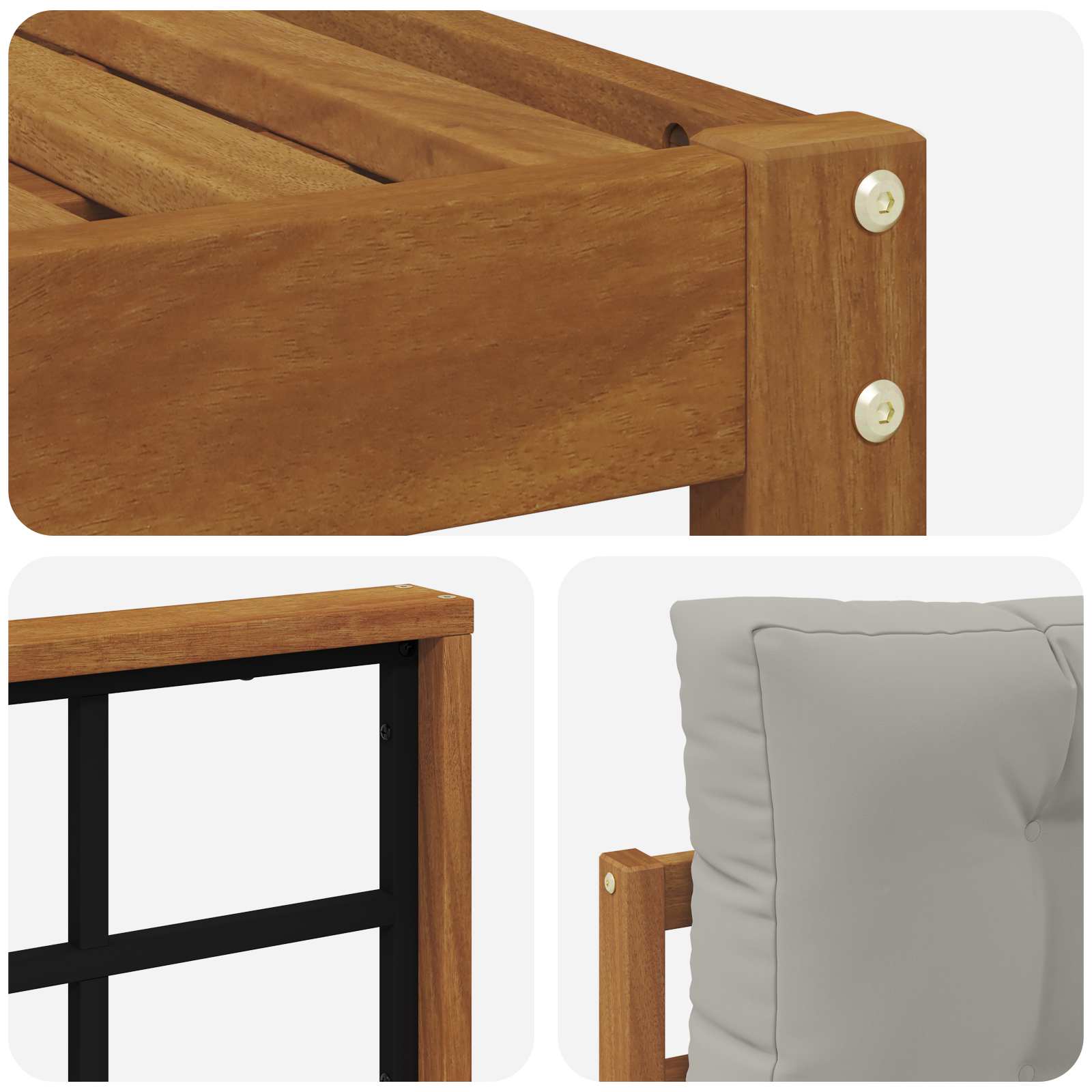 Tahle venkovní souprava sofa perfektně vystihuje moderní venkovní život. Nabízí skvělý design a funkčnost, ideální pro relaxaci na zahradě, terase, dvoře nebo u bazénu. Chlubí se přívětivou atmosférou s čistýma linkama a jednoduchými ozdobami. Hnědé akáciové dřevo ladí s každým venkovním stylem a zve k pohodlnému odpočinku.