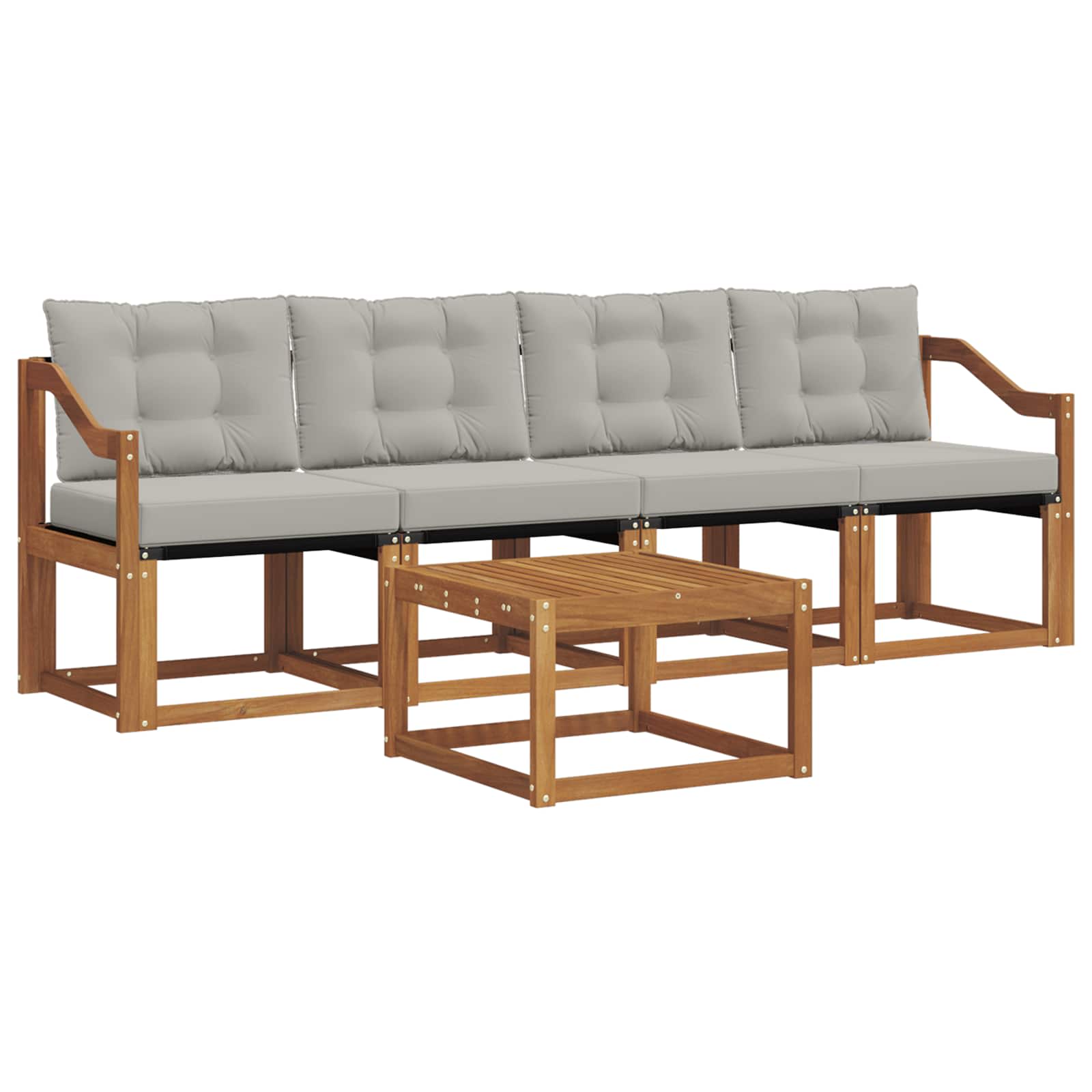 Tahle zahradní sada nábytku spojuje styl s funkčností, a stává se tak hlavním lákadlem pro každou zahradu nebo terasu. Moderní design s čistými liniemi dodává eleganci a podporuje relaxaci a setkávání venku. Celá je vyrobená z masivního akáciového dřeva, což zajišťuje její odolnost a dlouhou životnost, ideální volba pro ty, kdo chtějí spojit praktičnost s vylepšeným designem venkovního nábytku.