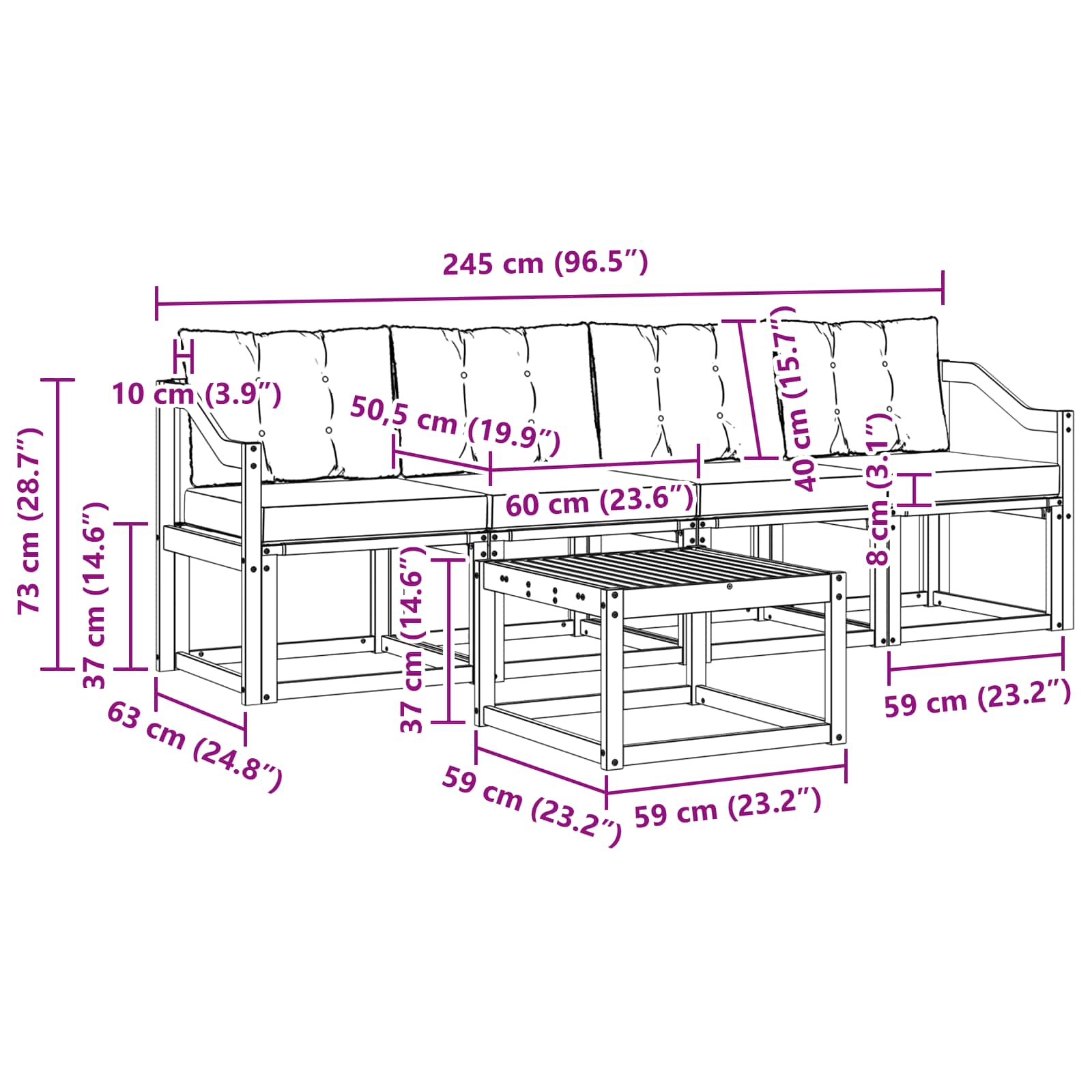 • 4 x Střední pohovka: 59 x 63 x 73 cm (DxŠxV)