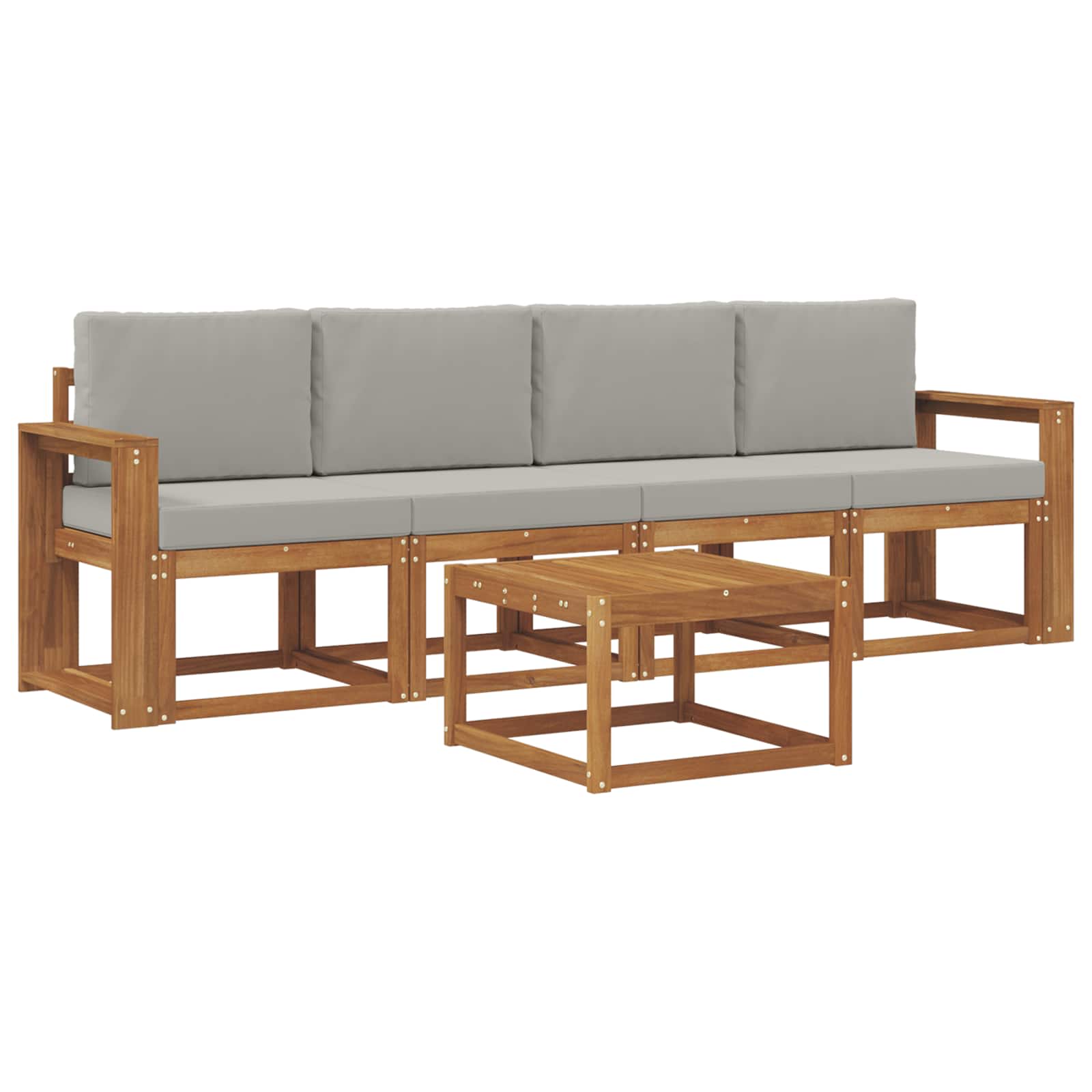 Tato souprava venkovního nábytku spojuje moderní design a praktické využití. Je ideálním kouskem, který zaujme na každé zahradě nebo terase. Minimalistické linie a čistý styl jí dodávají eleganci, která podněcuje k relaxaci i společenským setkáním. Vyrobená z akáciového dřeva, zaručuje dlouhou životnost a skvělý vzhled, ideální pro ty, kdo hledají funkčnost bez obětování stylu.