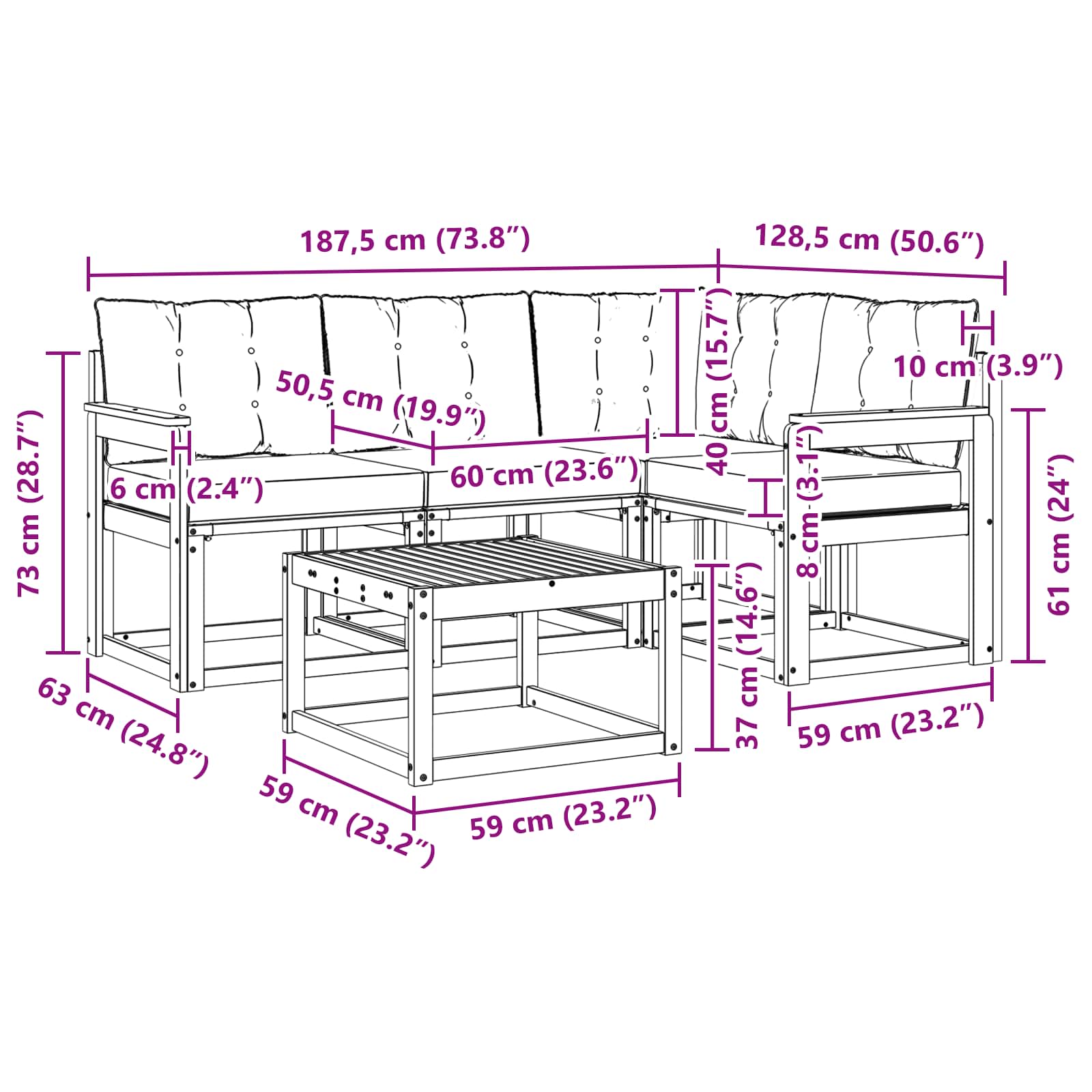 • 1 x Rohová pohovka: 63 x 63 x 73 cm (D x Š x V)