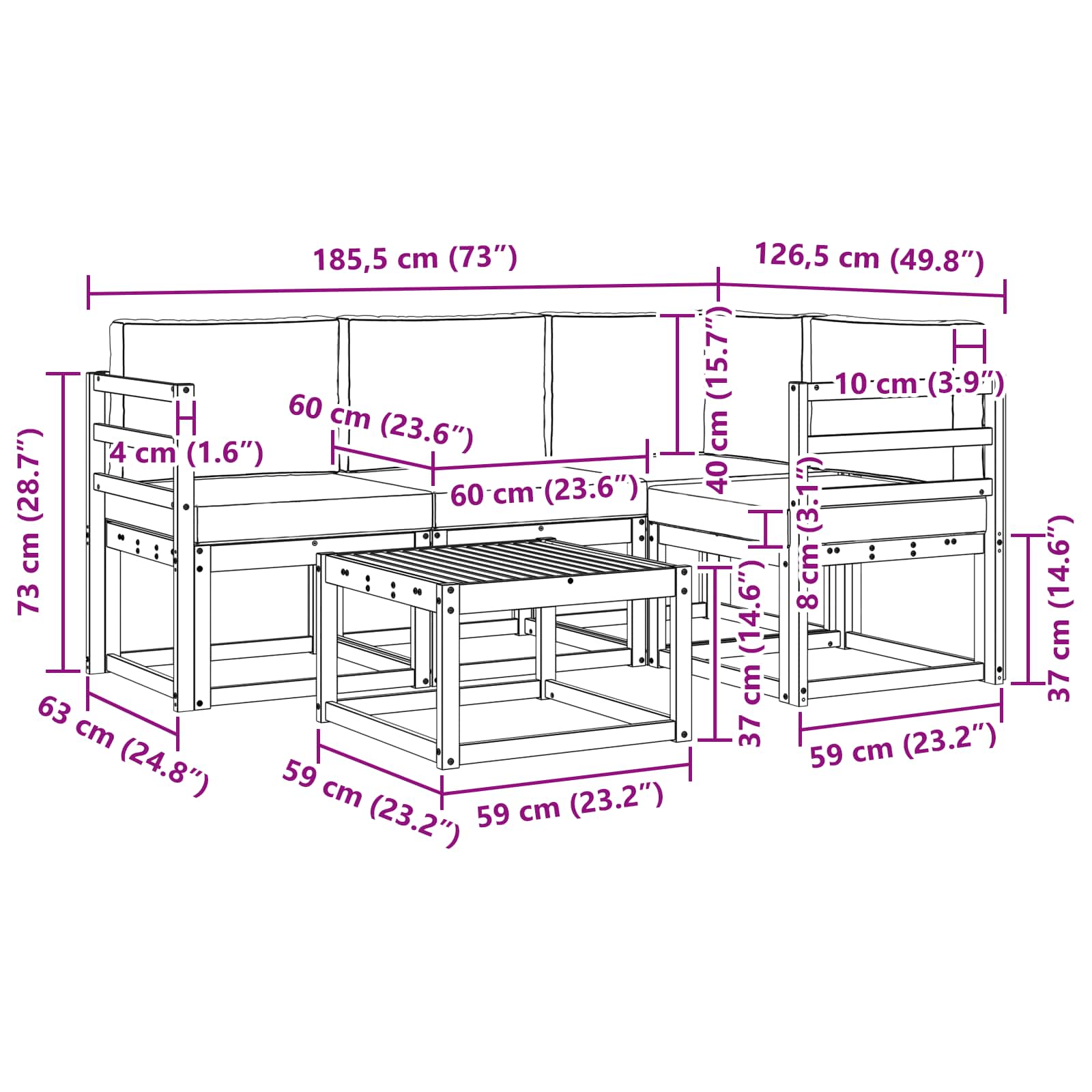 • 4 x Sedací polštář: 60 x 60 x 8 cm (D x Š x V)