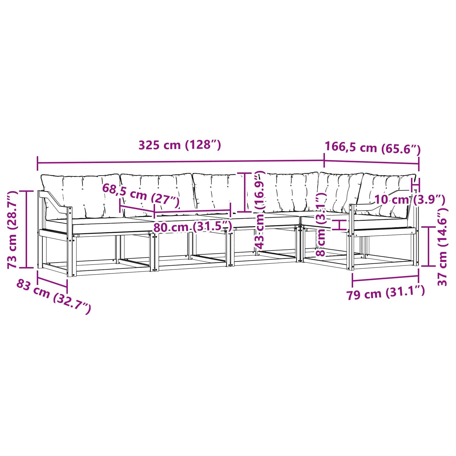 • 4 x středová pohovka: 79 x 83 x 73 cm (D x Š x V)