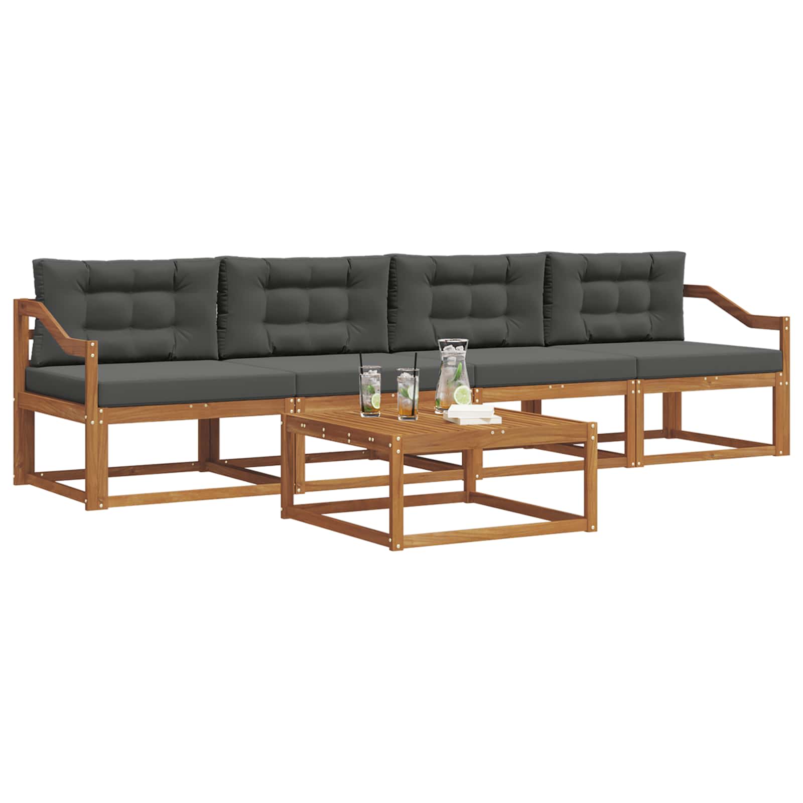 Tahle venkovní souprava sofa perfektně vystihuje moderní venkovní život. Nabízí skvělý design a funkčnost, ideální pro relaxaci na zahradě, terase, dvoře nebo u bazénu. Chlubí se přívětivou atmosférou s čistýma linkama a jednoduchými ozdobami. Hnědé akáciové dřevo ladí s každým venkovním stylem a zve k pohodlnému odpočinku.