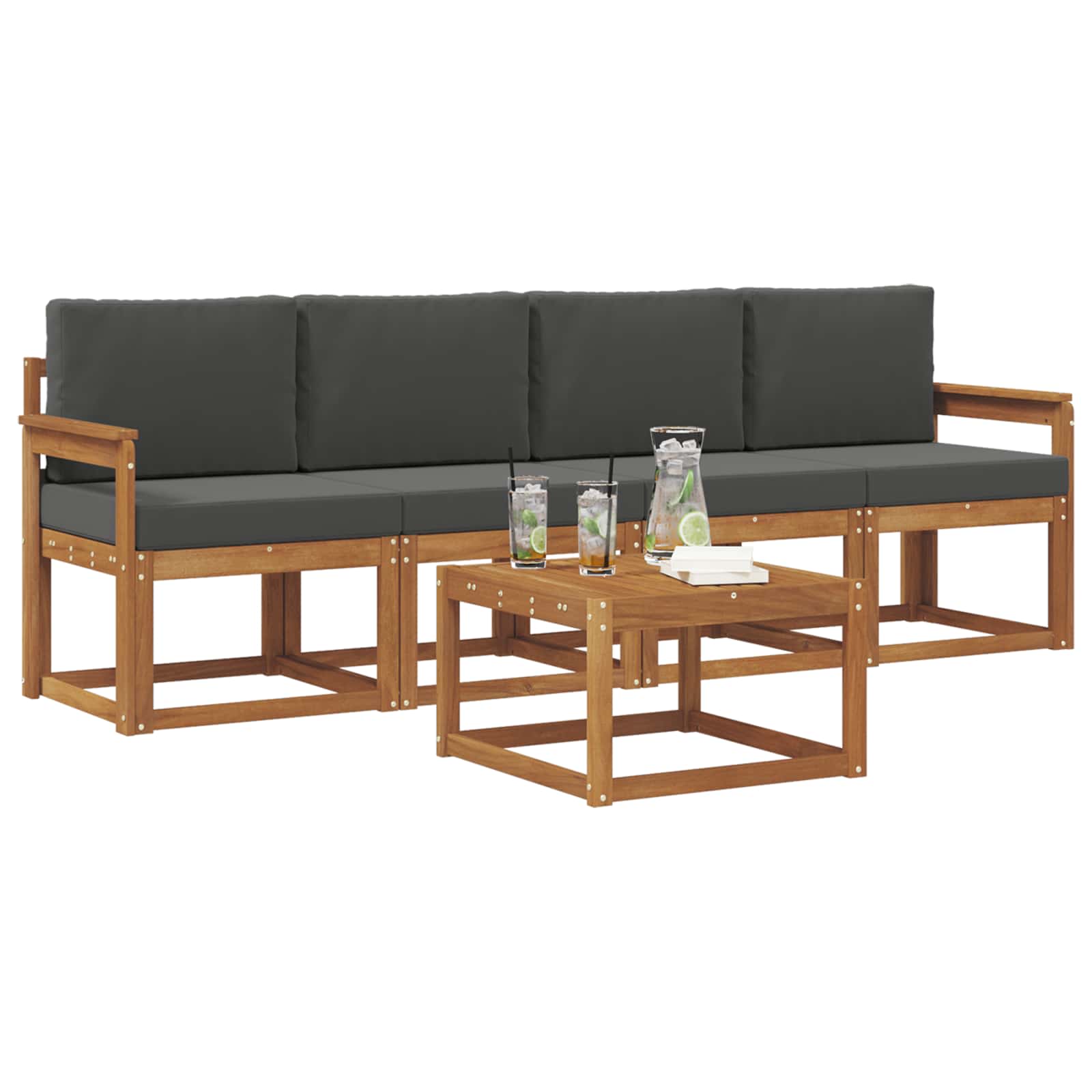 Tato souprava venkovního nábytku spojuje moderní design a praktické využití. Je ideálním kouskem, který zaujme na každé zahradě nebo terase. Minimalistické linie a čistý styl jí dodávají eleganci, která podněcuje k relaxaci i společenským setkáním. Vyrobená z akáciového dřeva, zaručuje dlouhou životnost a skvělý vzhled, ideální pro ty, kdo hledají funkčnost bez obětování stylu.