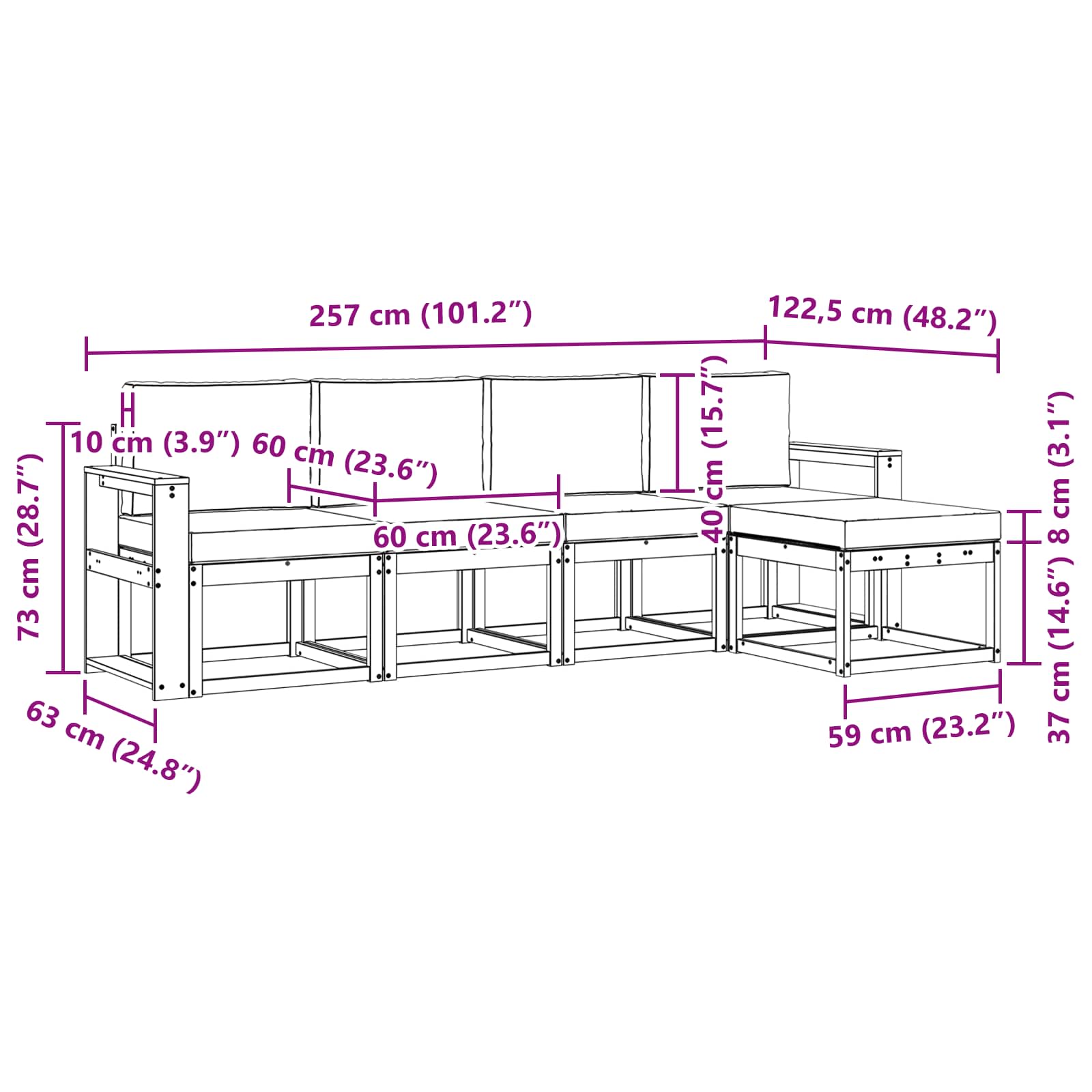 • 4 x Střední pohovka: 59 x 63 x 73 cm (D x Š x V)