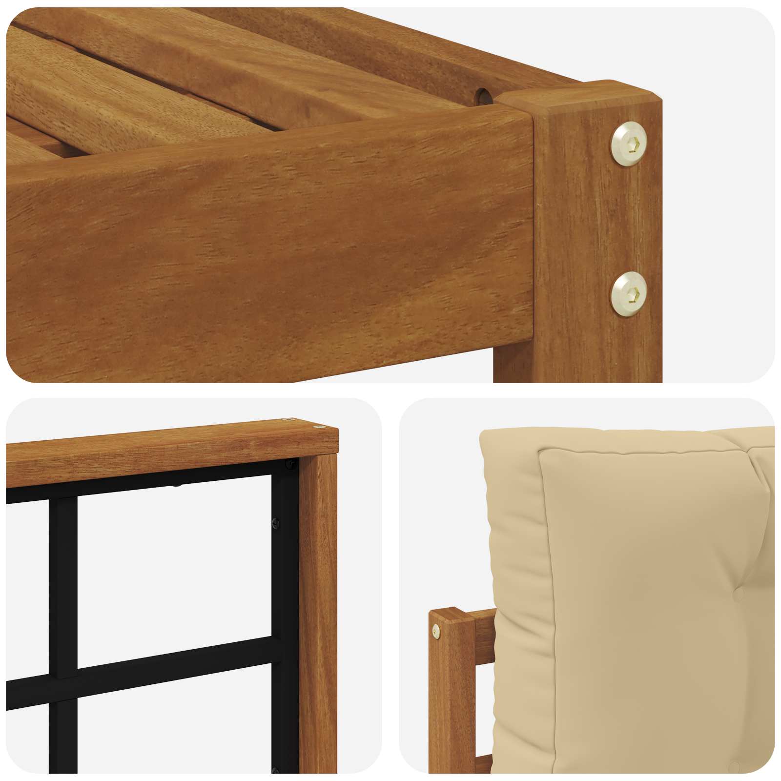 • Materiál z masivního akáciového dřeva: Tohle sofa je z kvalitního akáciového dřeva, které mu dává nadčasový vzhled a sílu. Dřevo přirozeně odolává počasí, takže je skvělé na všechny sezónní akce, bez deformace nebo ztráty barvy.