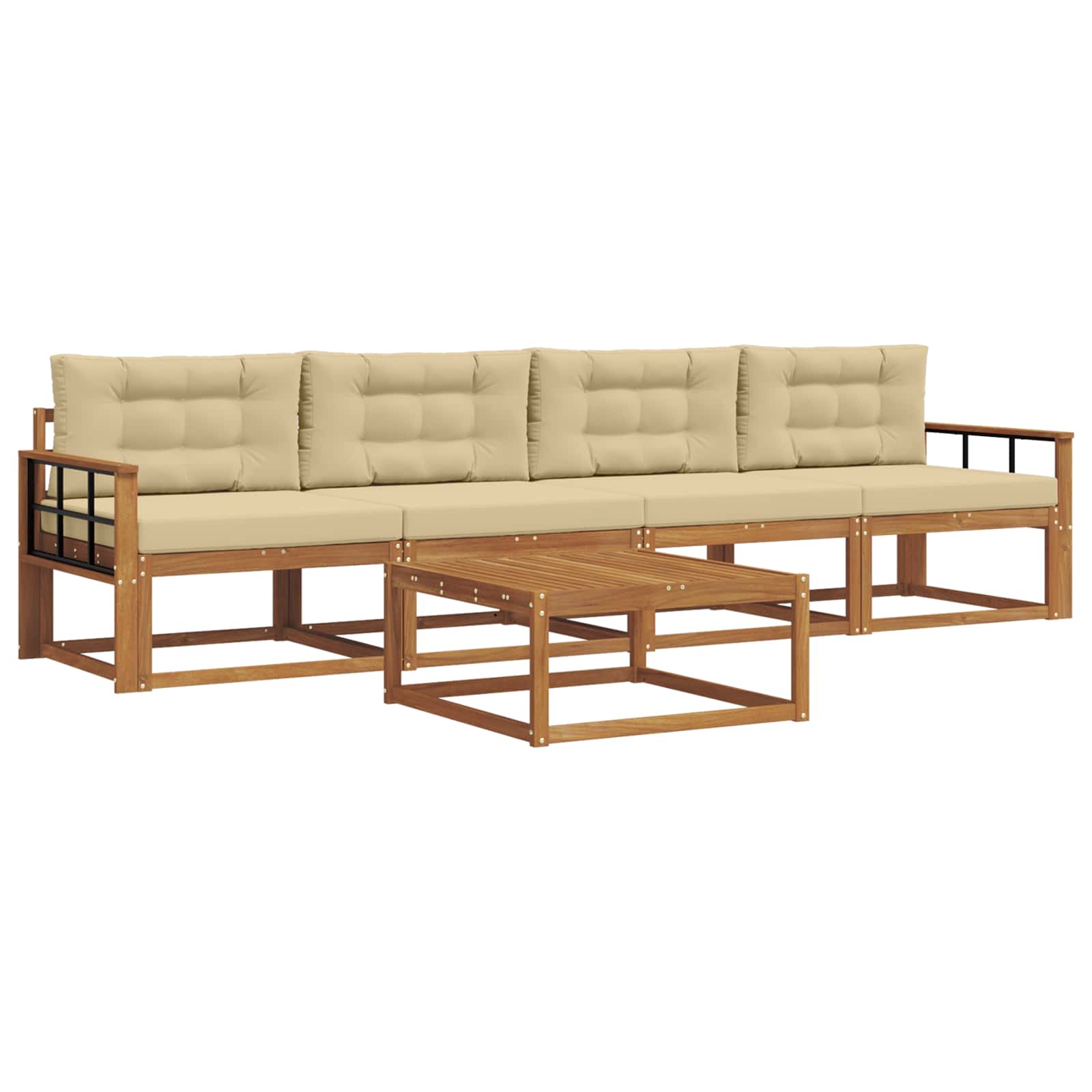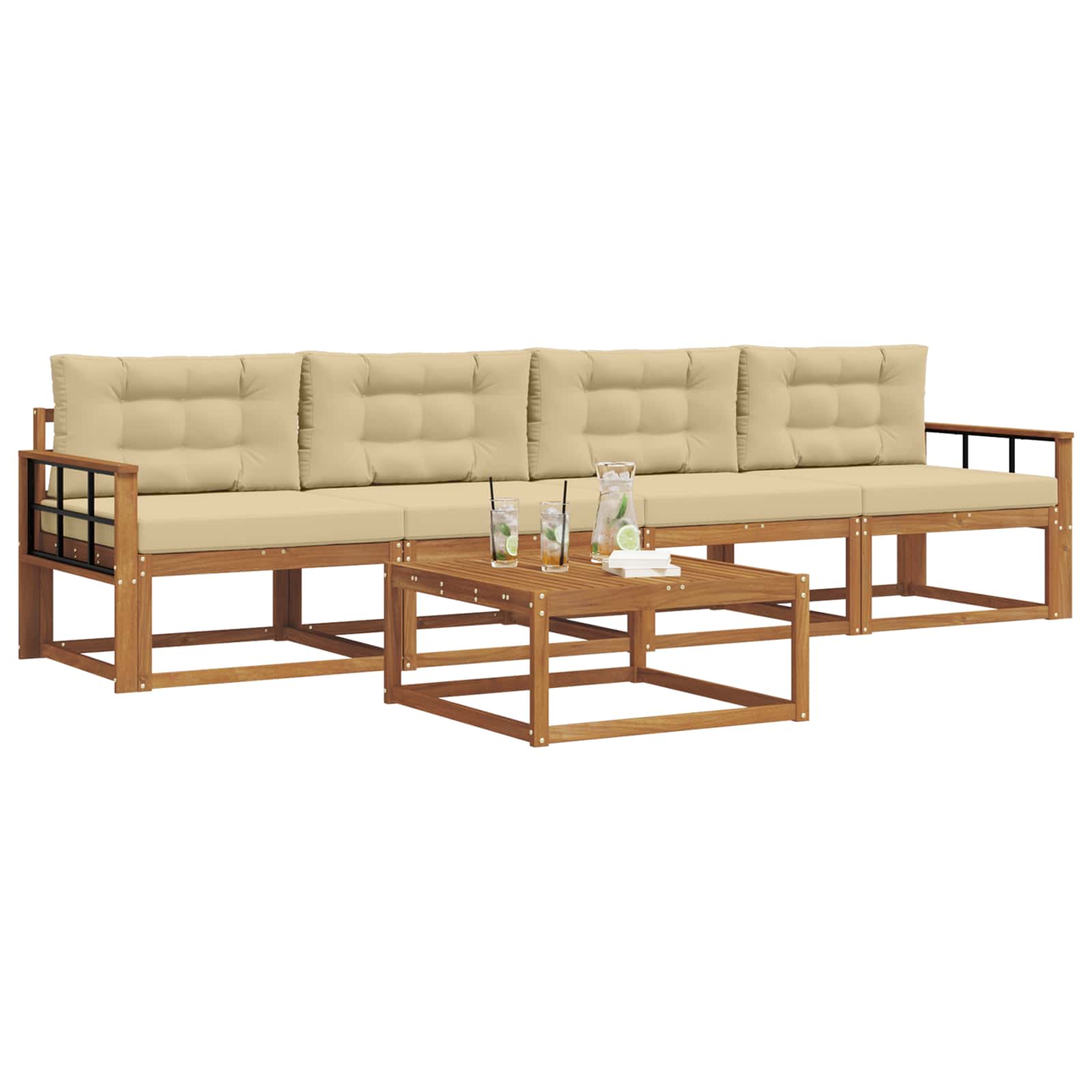 Tahle venkovní souprava sofa perfektně vystihuje moderní venkovní život. Nabízí skvělý design a funkčnost, ideální pro relaxaci na zahradě, terase, dvoře nebo u bazénu. Chlubí se přívětivou atmosférou s čistýma linkama a jednoduchými ozdobami. Hnědé akáciové dřevo ladí s každým venkovním stylem a zve k pohodlnému odpočinku.