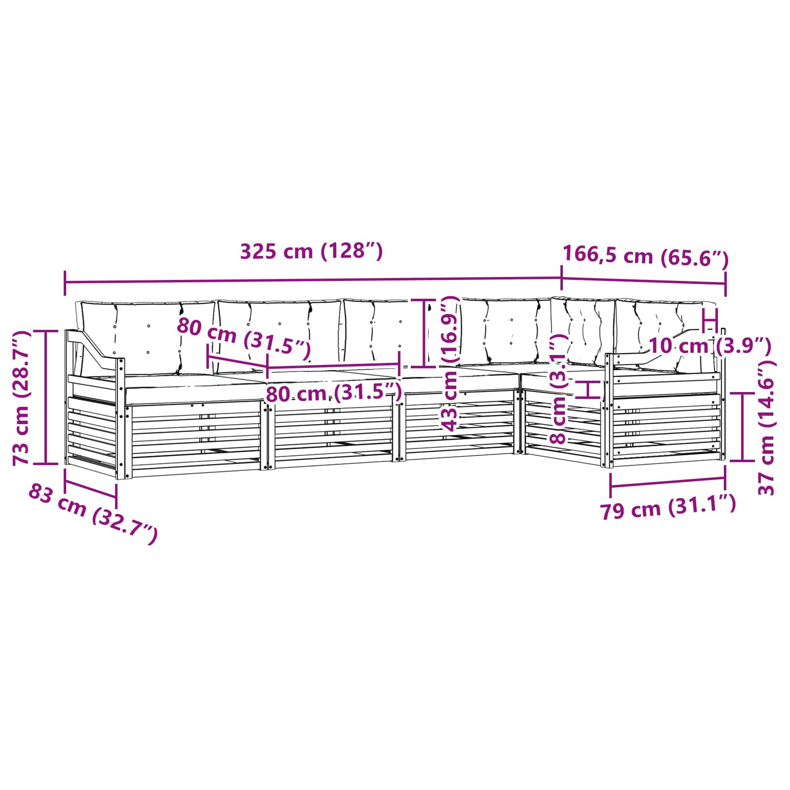 • 4 x prostřední pohovka: 79 x 83 x 73 cm (D x Š x V)