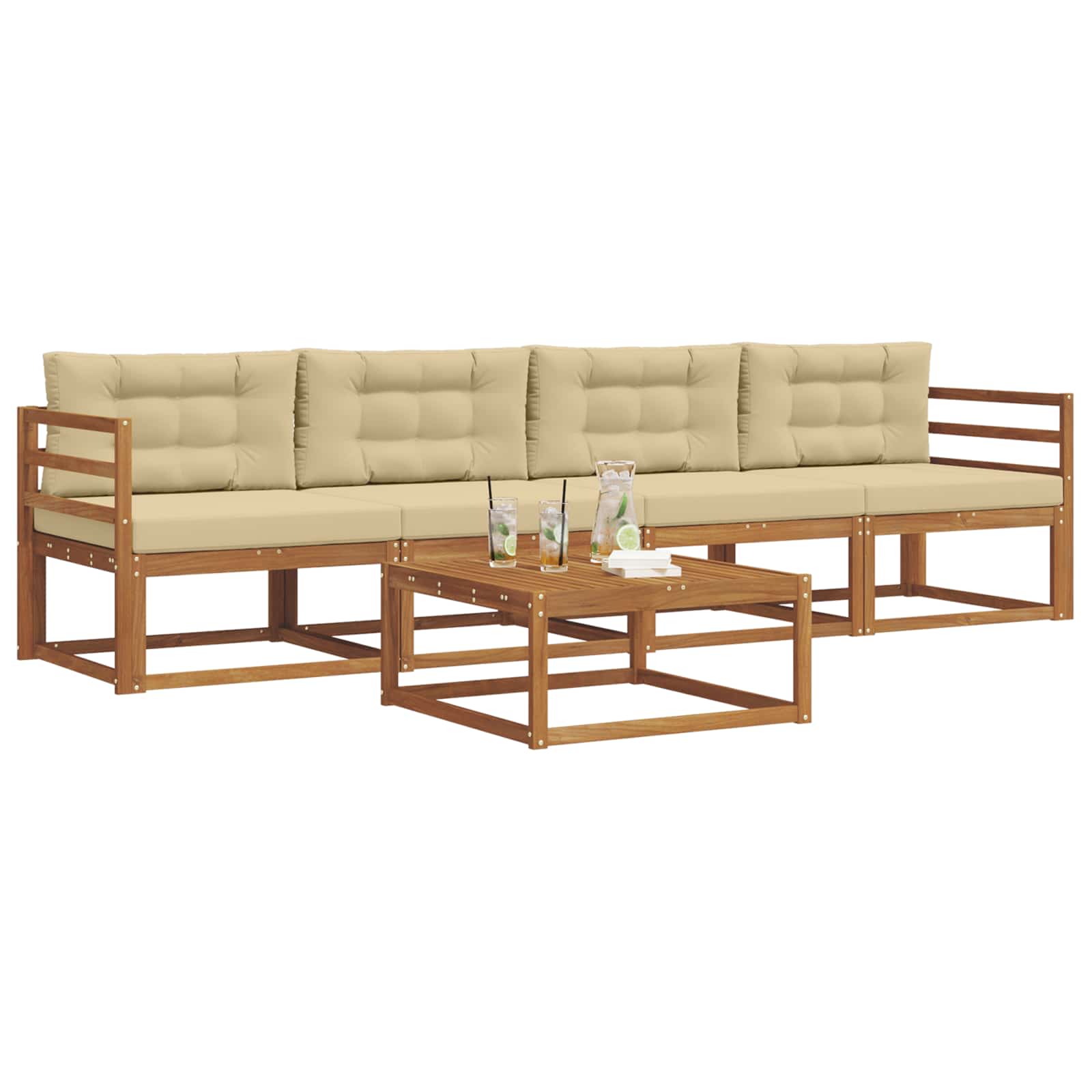 Tahle venkovní souprava sofa perfektně vystihuje moderní venkovní život. Nabízí skvělý design a funkčnost, ideální pro relaxaci na zahradě, terase, dvoře nebo u bazénu. Chlubí se přívětivou atmosférou s čistýma linkama a jednoduchými ozdobami. Hnědé akáciové dřevo ladí s každým venkovním stylem a zve k pohodlnému odpočinku.