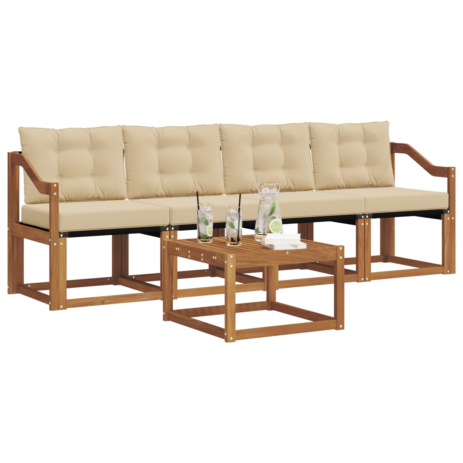 Tahle zahradní sada nábytku spojuje styl s funkčností, a stává se tak hlavním lákadlem pro každou zahradu nebo terasu. Moderní design s čistými liniemi dodává eleganci a podporuje relaxaci a setkávání venku. Celá je vyrobená z masivního akáciového dřeva, což zajišťuje její odolnost a dlouhou životnost, ideální volba pro ty, kdo chtějí spojit praktičnost s vylepšeným designem venkovního nábytku.