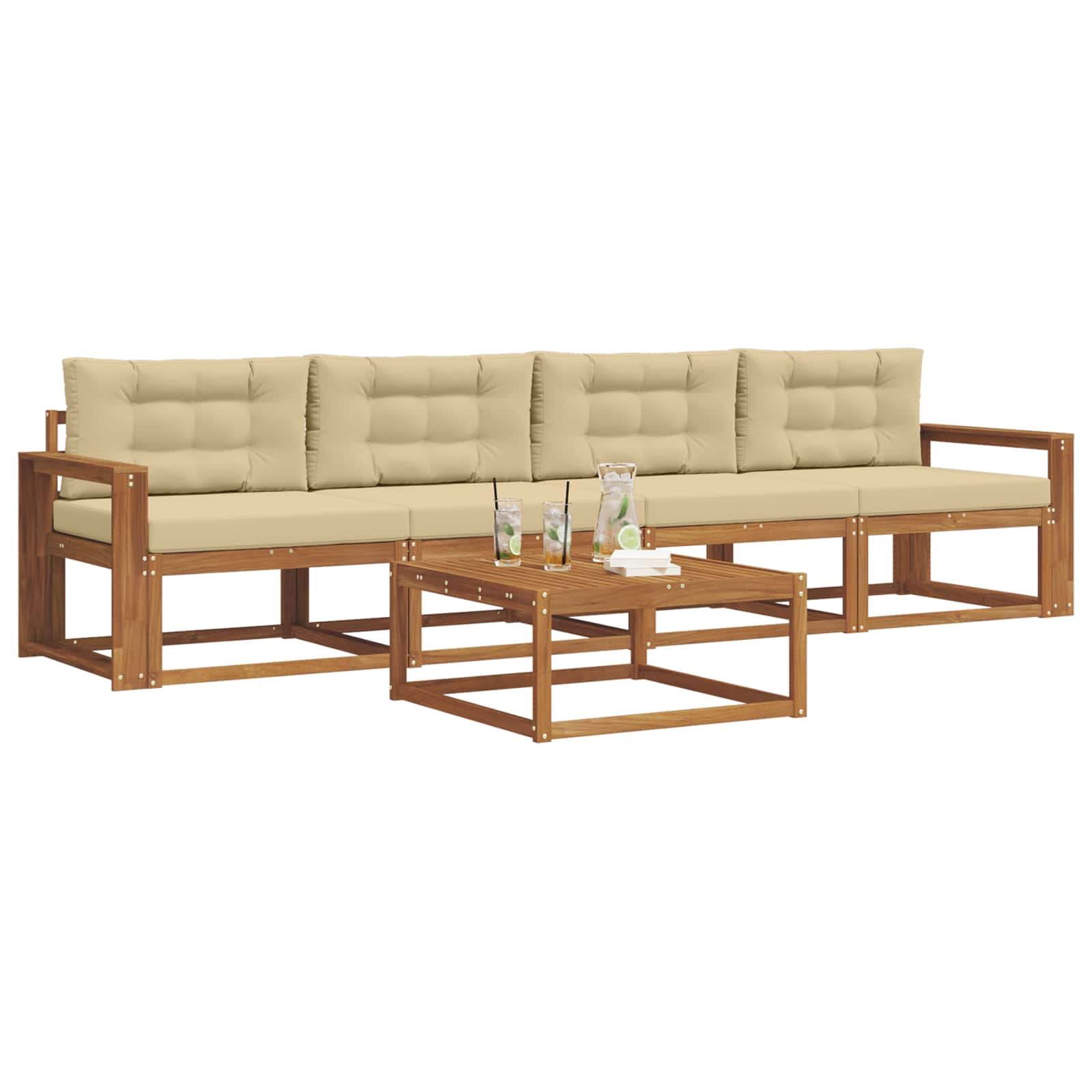 Tahle venkovní souprava sofa perfektně vystihuje moderní venkovní život. Nabízí skvělý design a funkčnost, ideální pro relaxaci na zahradě, terase, dvoře nebo u bazénu. Chlubí se přívětivou atmosférou s čistýma linkama a jednoduchými ozdobami. Hnědé akáciové dřevo ladí s každým venkovním stylem a zve k pohodlnému odpočinku.