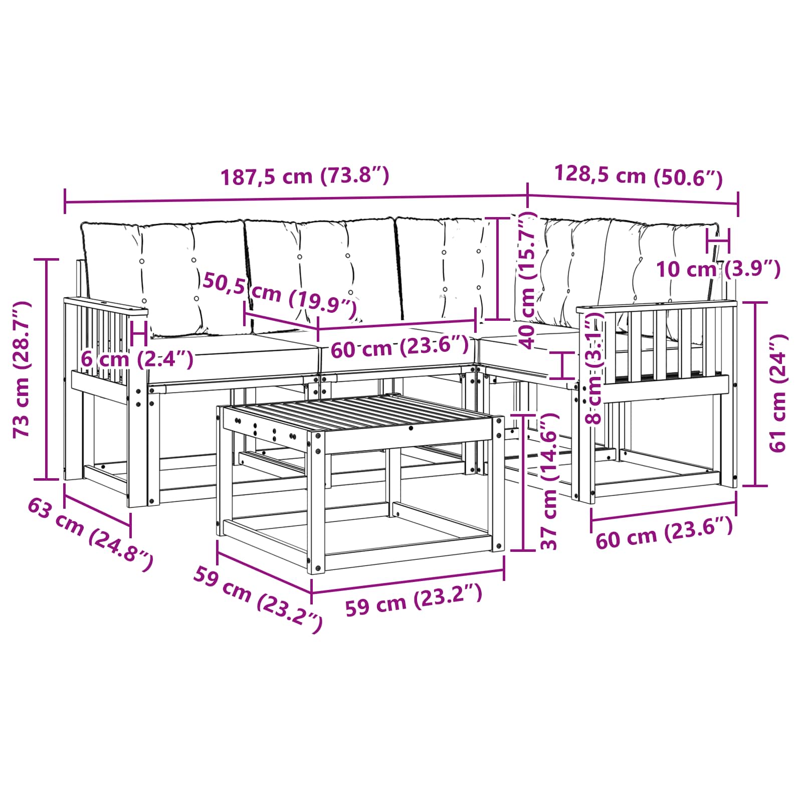 • 1 x Rohová pohovka: 63 x 63 x 73 cm (D x Š x V)