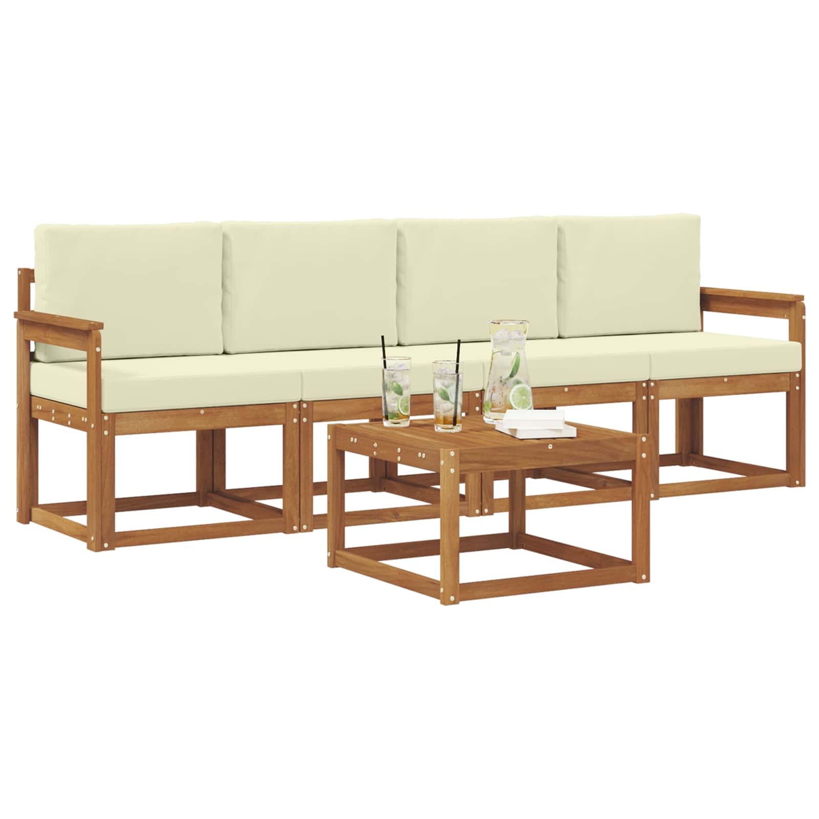 Tato souprava venkovního nábytku spojuje moderní design a praktické využití. Je ideálním kouskem, který zaujme na každé zahradě nebo terase. Minimalistické linie a čistý styl jí dodávají eleganci, která podněcuje k relaxaci i společenským setkáním. Vyrobená z akáciového dřeva, zaručuje dlouhou životnost a skvělý vzhled, ideální pro ty, kdo hledají funkčnost bez obětování stylu.