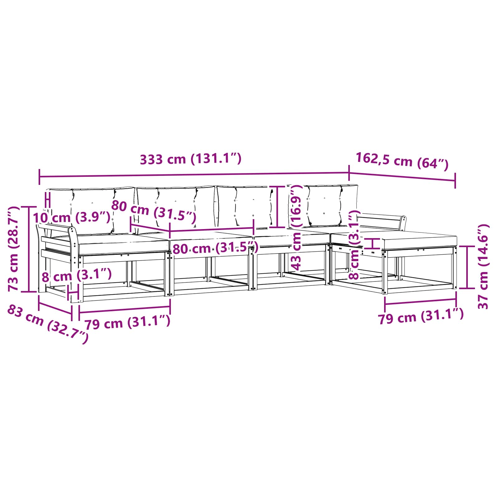 • 4 x Střední pohovka: 79 x 83 x 73 cm (D x Š x V)