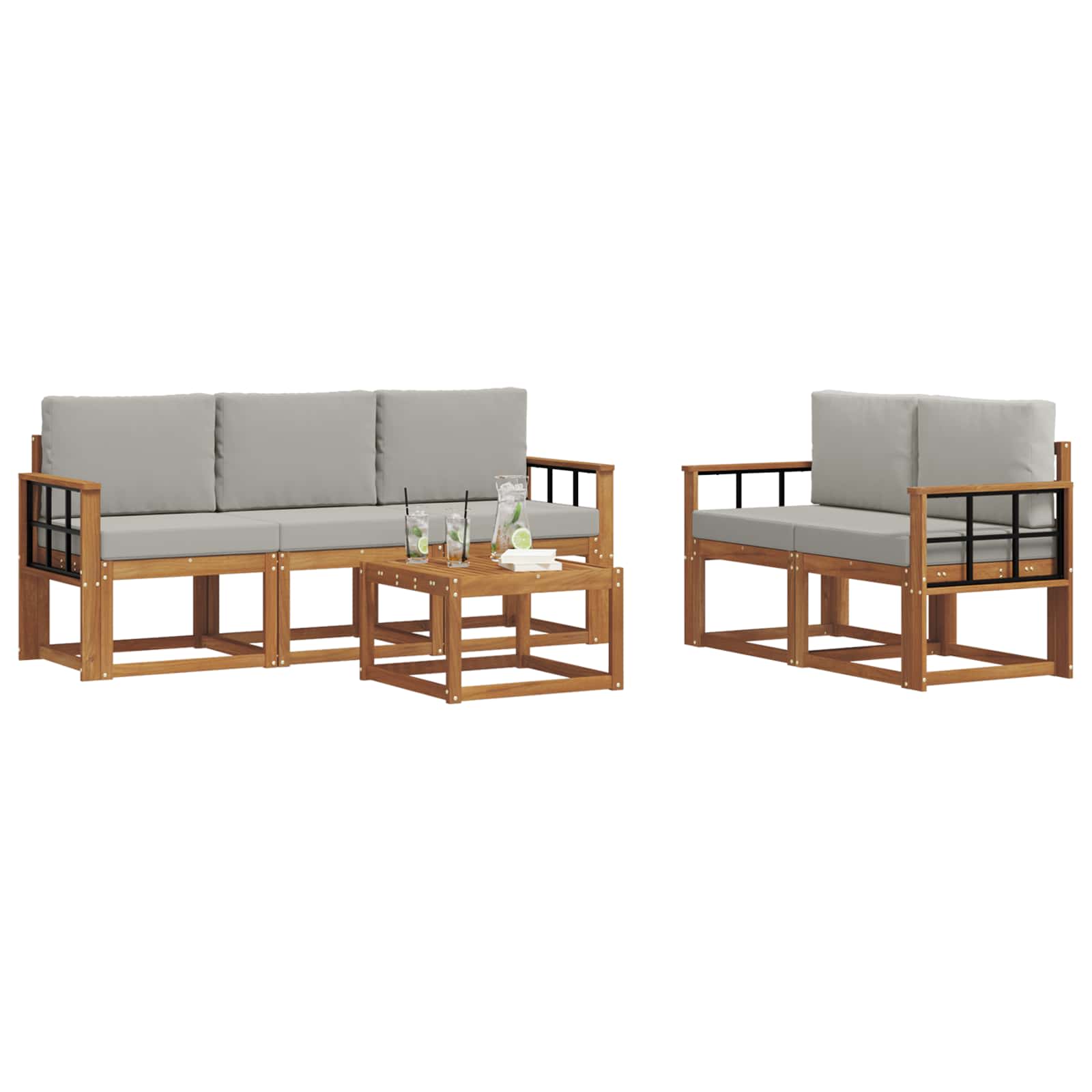 Tahle souprava venkovního nábytku spojuje styl s funkčností a skvěle se hodí jako ústřední bod pro vaši zahradu nebo terasu. Její moderní design s čistými liniemi vypadá elegantně a podněcuje k odpočinku venku a setkání s přáteli. Celá je vyrobená z masivního akáciového dřeva, což zaručuje odolnost a krásný vzhled, ideální pro ty, kdo hledají praktický a šik nábytek do exteriéru.
