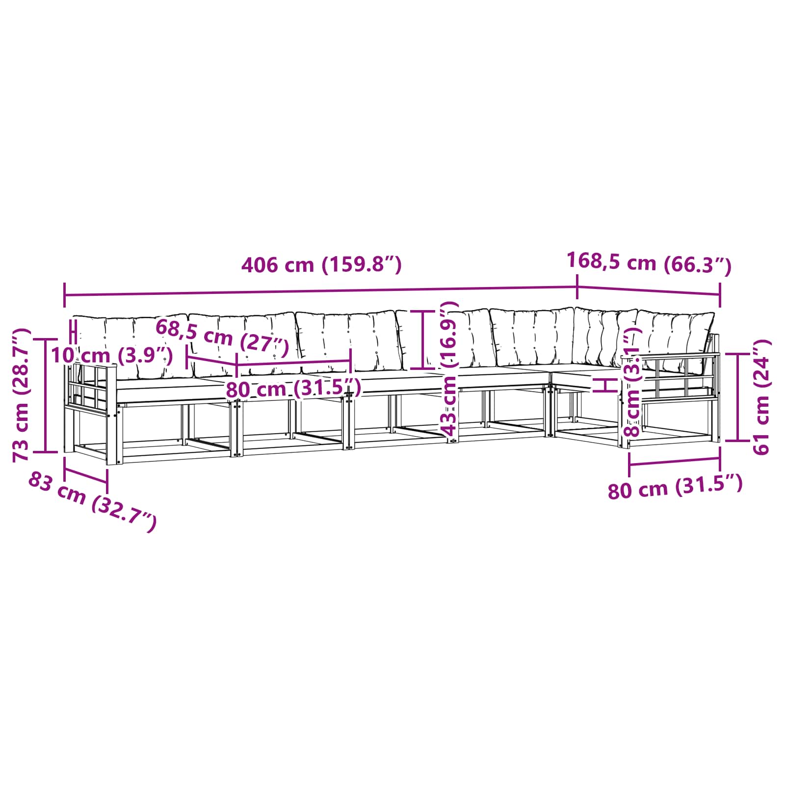 • 7 x zadní polštář: 80 x 43 x 10 cm (D x Š x V)