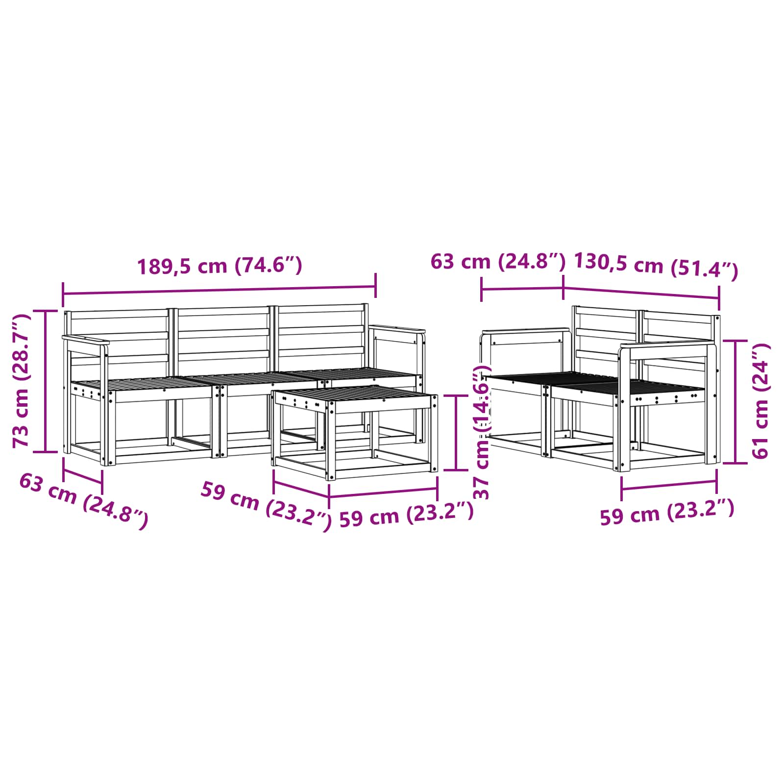 • 5 x Střední pohovka: 59 x 63 x 73 cm (D x Š x V)