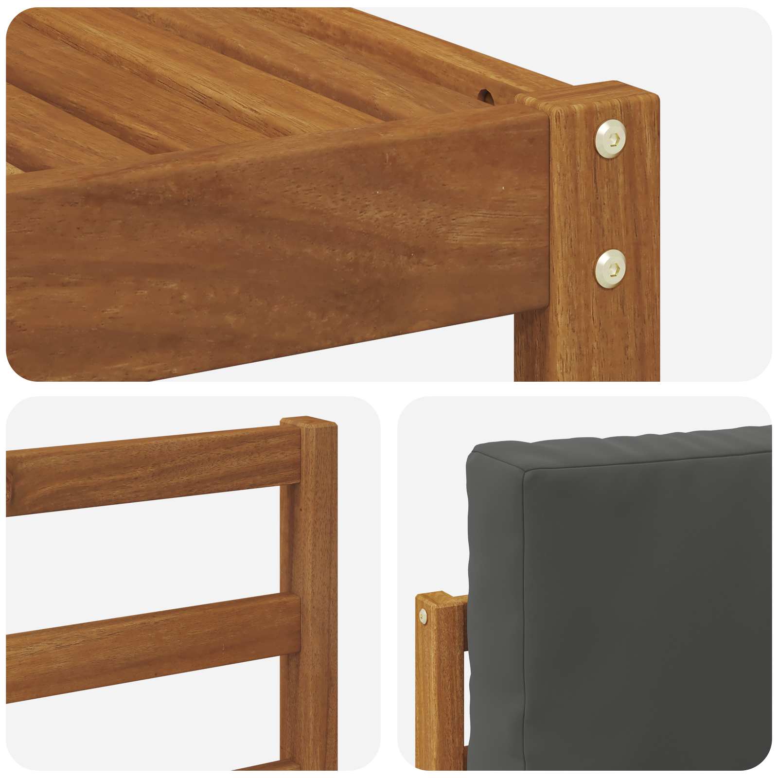 Tento venkovní nábytek přináší perfektní mix moderního stylu a praktického designu. Vytvořený pro venkovní prostory, jeho vzhled je jednoduchý a elegantní, doplněný teplou barvou masivního akáciového dřeva. Ať už máte terasu nebo dvorek, tento set přetvoří vaši zahradu na pohodové místo k odpočinku se svým lákavým designem a funkčním uspořádáním. Ideální pro rodiny a hostitele, jeho smart design spojuje pohodlí a hezký vzhled, láká hosty, aby si pobyt užili co nejdéle.