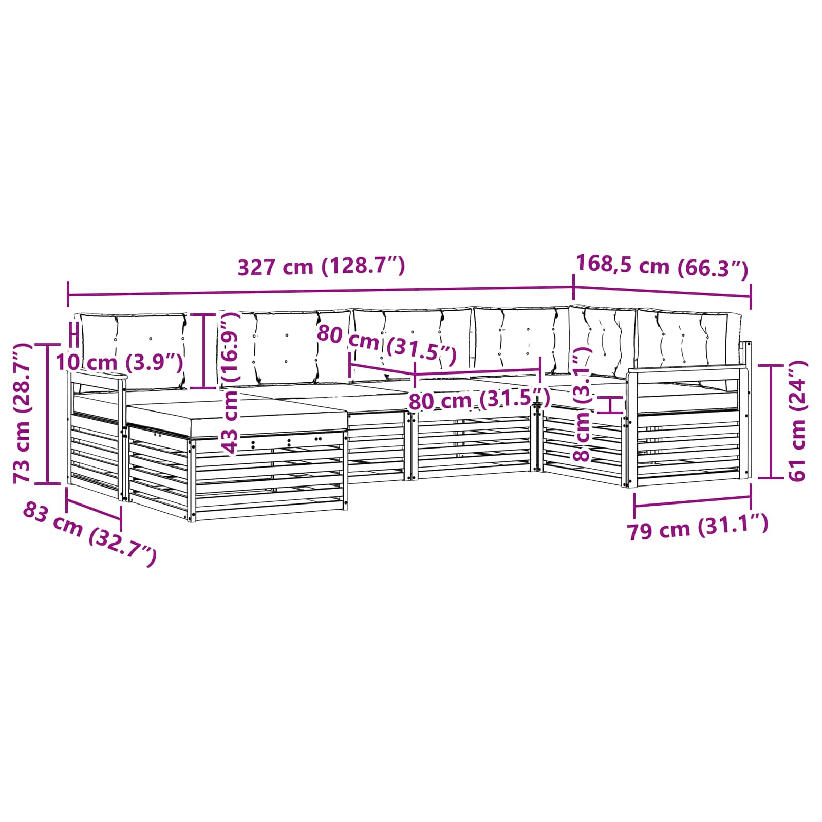 • 6 x Polštář na sezení: 80 x 80 x 8 cm (DxŠxV)