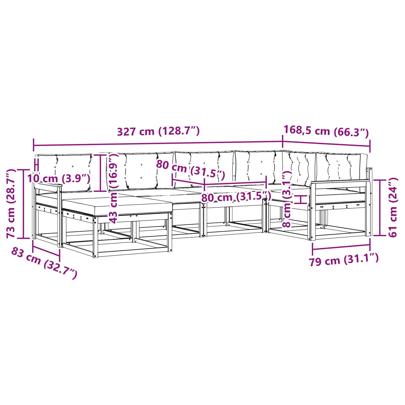 • 4 x Střední pohovka: 79 x 83 x 73 cm (D x Š x V)