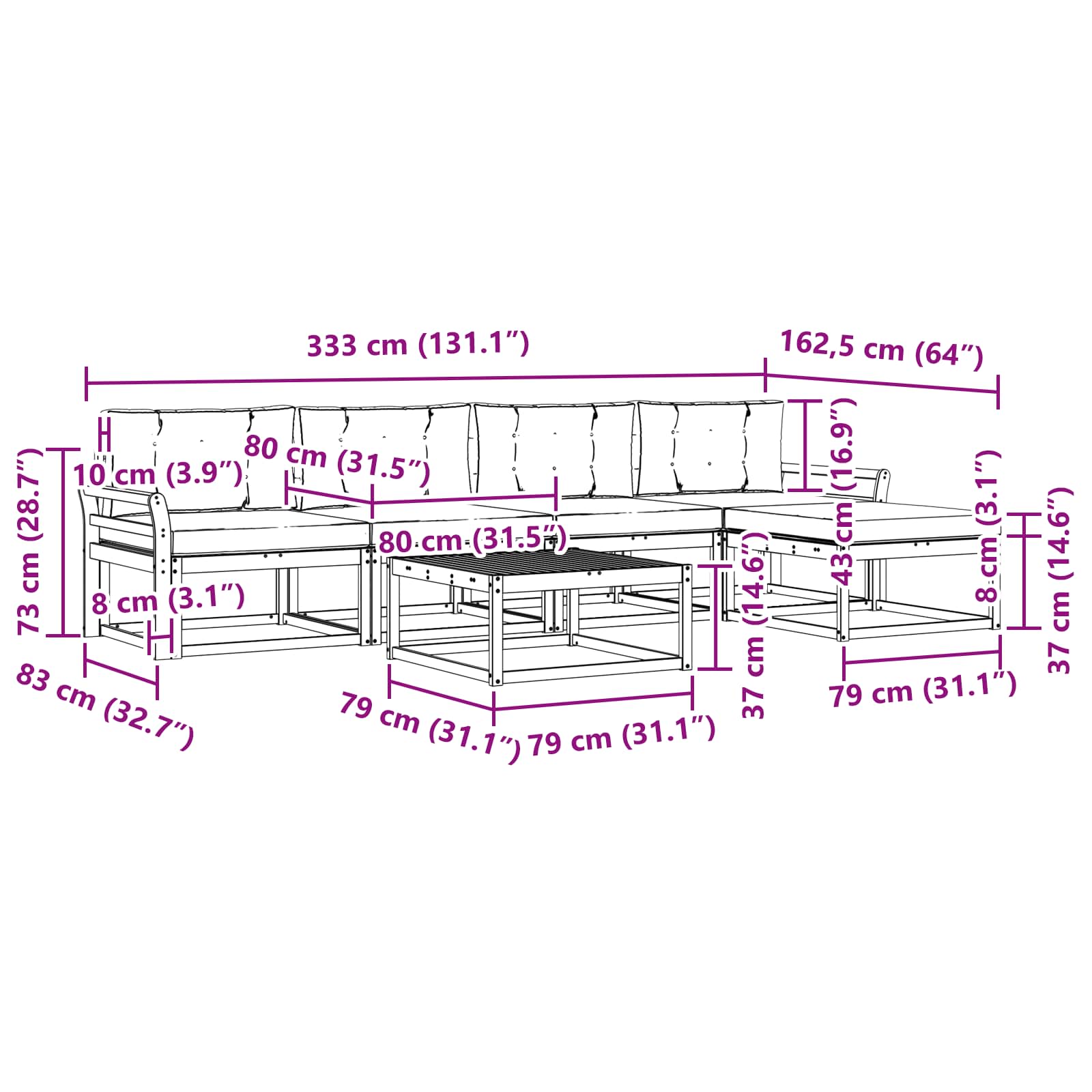 • 4 x střední pohovka: 79 x 83 x 73 cm (D x Š x V)